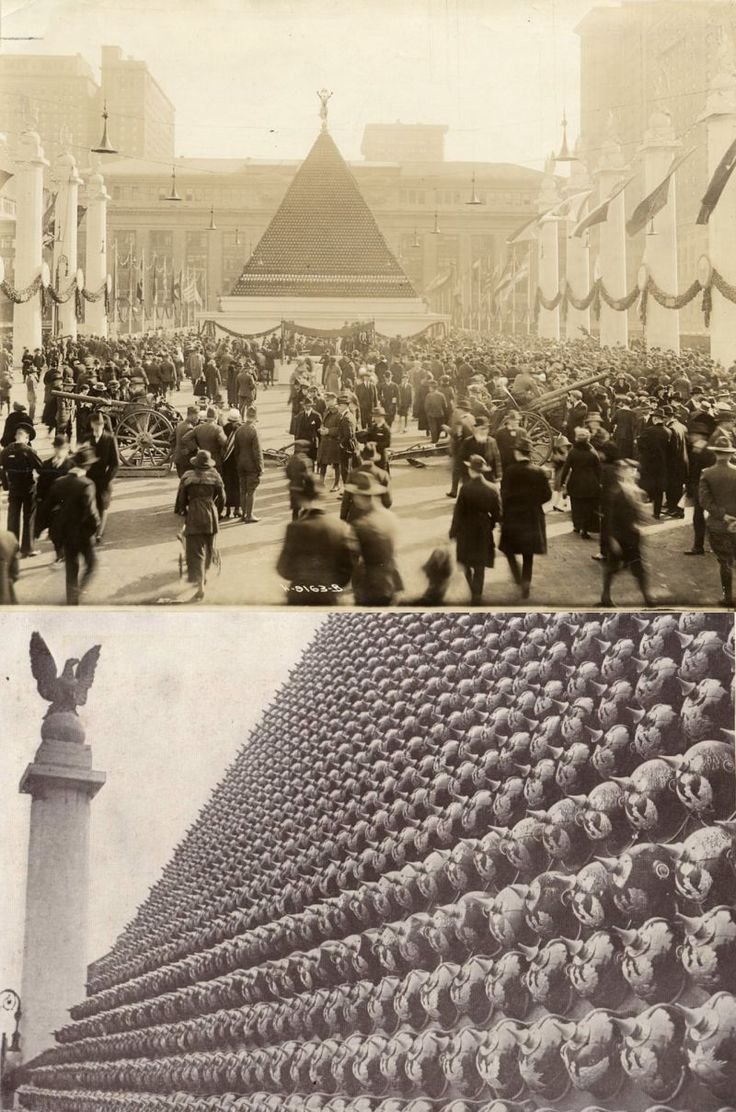 Američané mají velice zvláštní zvyk, vršit na sebe věci. Ne jinak tomu bylo koncem první světové války. Tehdy před Grand Central Station na Park Avenue v New Yorku, vznikla Mohutná pyramida s 12 000 ukořistěnými německými přilbami. Byla součástí tematicky vyzdobené ulice zvané "Victory Way", kde mohli návštěvníci vidět rovněž další ukořistěnou techniku nepřítele. Jelikož ještě nebyl konec války, byla akce spojena s vybíráním příspěvků pro vojáky a patrně i upisování válečných půjček. Moto znělo "nechme chlapce dokončit jejich práci". Nutno podotknout, že mezi některými návštěvníky, vyvolávala tato monumentální pyramida spíše strach, než nadšení. Historie přileb typu Pickelhaube sahá až do roku 1842, kdy ji pruský král Fridrich Vilém IV. zavedl pro pruskou armádu. Vyráběny byly z kůže a zdobeny dekorativním kováním. V první světové válce přes ně vojáci nosili natažený potah, který je chránil před špínou. Nutno podotknout, že v roce 1918 se již jednalo o zastaralý kousek, jelikož již začátkem roku 1916, byly postupně nahrazovány novou ocelovou přilbou M16. Z amerického pohledu ale nepřítele lépe vystihovala tato barbarská pokrývka hlavy s hrotem.