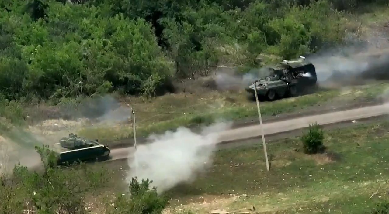 Extrémně těsné bojové střetnutí mezi ukrajinským Bradleym a ruským BTR-82 obloženým pěchotou. Bradley zahajuje palbu na ruský BTR-82 z bezprostřední blízkosti, ten prosviští kolem a skončí opodál. Video od 47. mechanizované brigády.