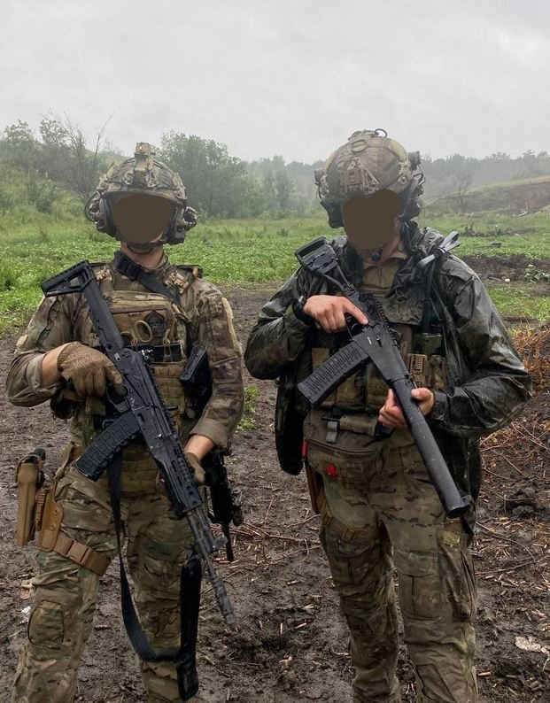 Ukrajinští speciálové (SOF) s trofejní puškou AK-12 a novou ASM Val (6P30M). Jeden z vojáků má na sobě též bundu v ruské kamufláži EMR.