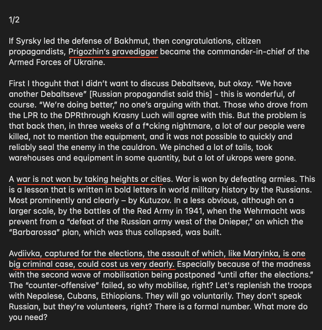 Objevil se nový post ruského fanatického bloggera Murze, který nějakou dobu mlčel, protože je stíhaný za dehonestaci armády. Kritizuje útok na Avdiivku jako "jeden velký kriminální případ" a plýtvání silami jenom na symbolické vítězství před putinovým zvolením.