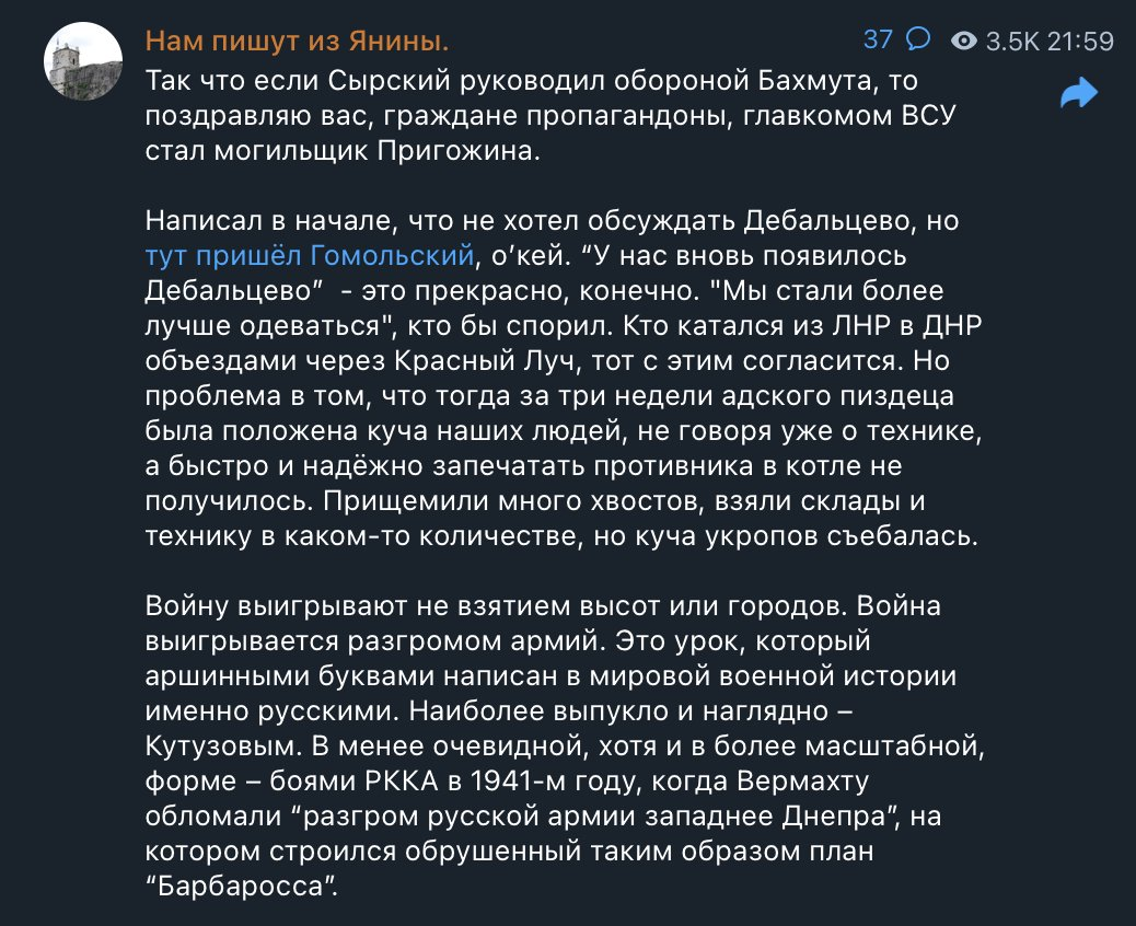 Také nazývá Syrského "Prigožinovo hrobařem" kvůli jeho velení nad porážkou Wagnera a obviňuje ruská média z nepoctivého pokrytí ofenzivy. A odhaduje že v létě Rusku mohou opět chybět síly a rezervy.