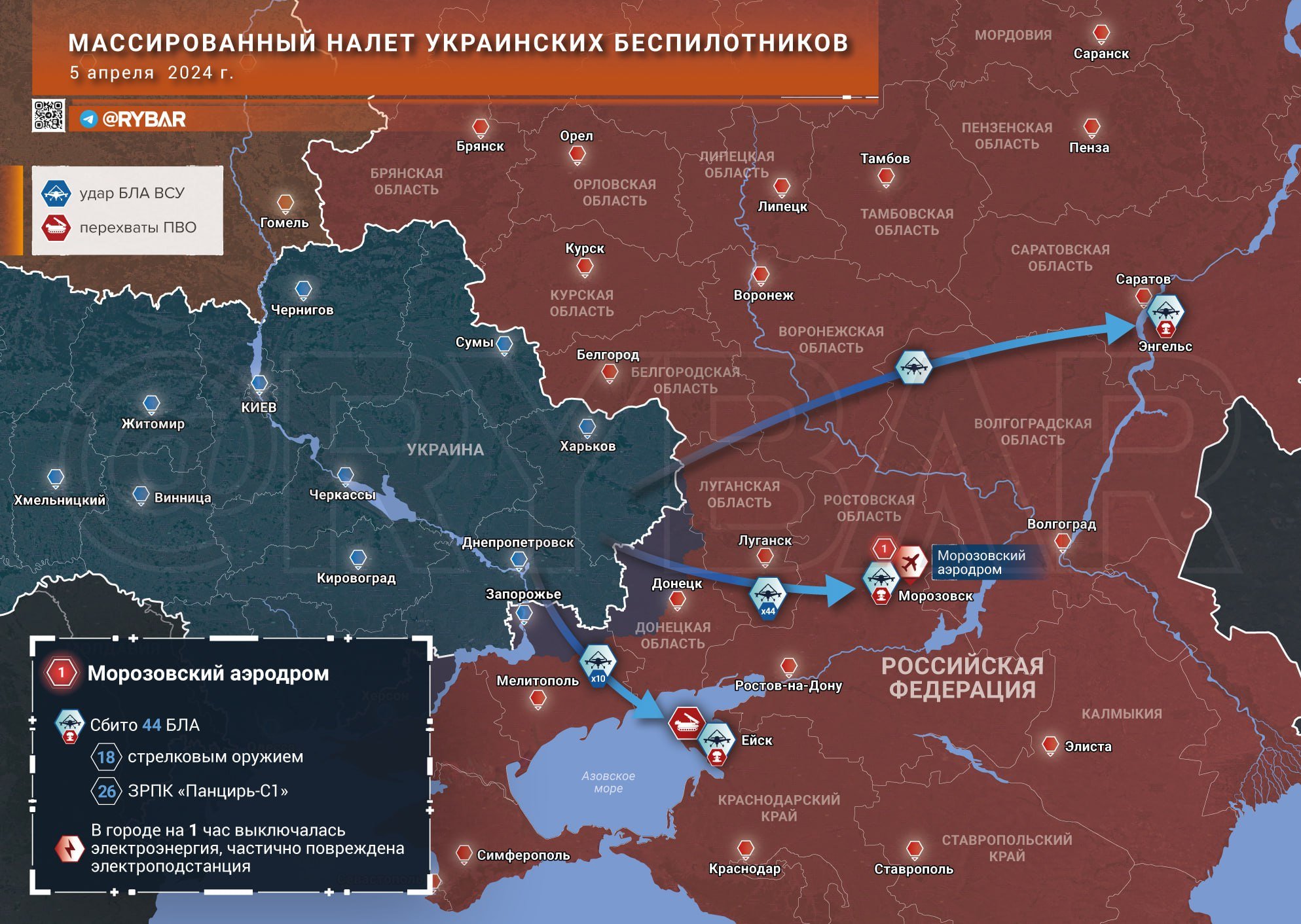 Hlavní úder přišel na letiště Morozovsk v Rostovské oblasti, kam ukrajinské formace vyslaly 44 dronů. Přesný typ není znám a bude jasný, až budou trosky prozkoumány, ale je velmi pravděpodobné, že se jedná o stejné bezpilotní letouny, které nepřítel používal v posledních týdnech.