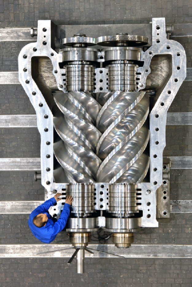 Jedná se o typ plynového kompresoru, který používá šroubový mechanismus s kladným rotačním posunem. Běžně se používají jako náhrada pístových kompresorů, kde jsou zapotřebí velké objemy vysokotlakého vzduchu, a to buď pro velké průmyslové aplikace, nebo pro provozování výkonných vzduchových nástrojů, jako jsou kladiva a rázové utahováky. Proces stlačování plynu rotačních šroubů je plynulý posuvný pohyb, takže dochází k velmi malému pulzování nebo rázovému proudění, jako je tomu u pístových kompresorů. Kompresní blok je složen ze dvou asymetrických, šroubových rotorů, které se točí proti sobě. Plyn, který blok nasaje do prostoru mezi rotory, prostupuje šroubovicemi a otáčením se prostor mezi nimi zmenšuje. Takto stlačený vzduch vychází z kompresního bloku k dalšímu zpracování. Šroubový kompresor je určen pro trvalou zátěž, má dlouhou životnost, nízkou hlučnost a stláčení probíhá bez pulzací. Nevýhodou je cena, nevhodnost pro přerušovaný chod výroby a nutná přesná dimenzace, případně frekvenční měnič (poslední dobou velmi oblíbené). Šroubový kompresor byl poprvé patentován v roce 1878 Heinrichem Krigarem v Německu, ale jeho patent vypršel, aniž by byl postaven funkční stroj. Moderní šroubový kompresor vyvinul švédský inženýr Alf Lysholm (1893-1973), když hledal způsob, jak překonat přepětí kompresoru v plynových turbínách. Návrh si nechala roku 1935 patentovat společnost Ljungstroms Angturbin AB (pro niž Lysholm pracoval) a poté byl široce licencován dalším výrobcům. V roce 1951 byla společnost přejmenována na Svenska Rotor Maskiner (SRM). V roce 1952 byl poprvé použit skotskou strojírenskou společností Howden řezací stroj Holroyd k výrobě spirálových rotorů kompresoru, což výrazně snížilo náklady i dobu výroby. V roce 1954 Howden a SRM společně vyvinuly první šroubový kompresor zaplavovaný olejem. Což zajišťovalo jak chlazení, které umožňovalo vyšší tlakové poměry, tak eliminaci rozvodových kol. Asymetrické rotory byly poprvé patentovány společností SRM a následně komerčně představeny společností Sullair v roce 1969. Zavedení asymetrických rotorů zlepšilo těsnění a dále zvýšilo účinnost.