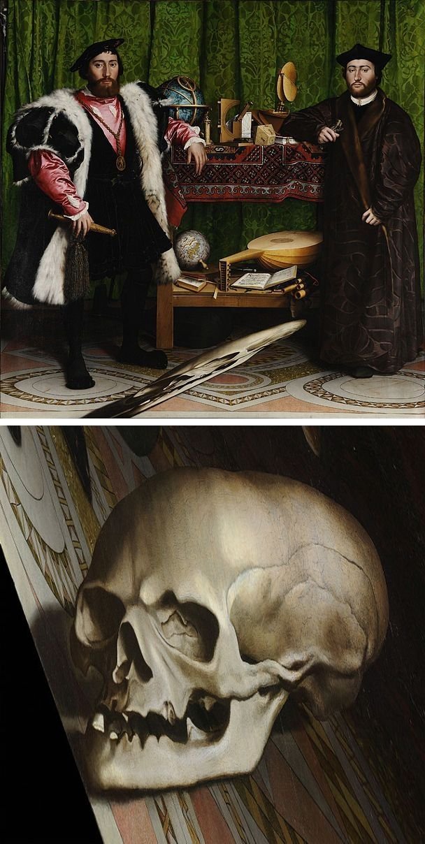 Obraz německého renesančního malíře Hanse Holbeina mladšího z roku 1533, proslul pozoruhodnou optickou iluzí. Podlouhlý předmět ležící v popředí na podlaze mezi oběma vyslanci je lebka - motiv vanitas (nicotnost). Lze ji však jako takovou rozpoznat pouze při pohledu na obraz zboku a to pod velmi ostrým úhlem, protože je značně deformovaná (anamorfická, perspektivně zkreslená). Je tedy možné, že obraz měl viset na schodišti, kde by byl pozorován zešikma, a lebka tak mohla skvěle vyniknout. Vanitas (latinsky prázdnota, nicotnost) je klíčový pojem biblické knihy Kazatel, poukazující na pomíjivost a marnost života a lidského úsilí. Ve výtvarném umění se tak nazývají díla, která nicotnost a pomíjivost tematizují; do jisté míry se překrývají s tématem memento mori (pamatuj na smrt, tedy nezapomeň že jsi smrtelný). Téma vanitas bylo zvlášť populární v Nizozemí 16. a 17. století. Tehdy v umění vznikala zátiší zobrazují předměty symbolizující smrt (lebka), čas (hodiny), pomíjivost (vadnoucí květy a hnijící ovoce) nebo marnost zábavy (hudební nástroje či karty).