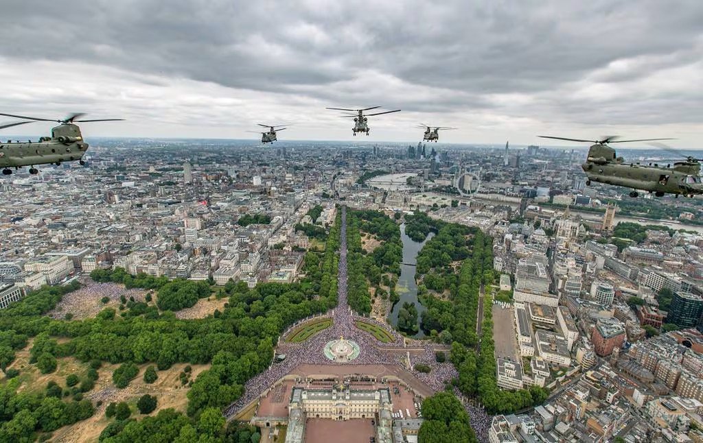 Britské Chinooky na Buckinghamským palácem při výročí 100 let RAF