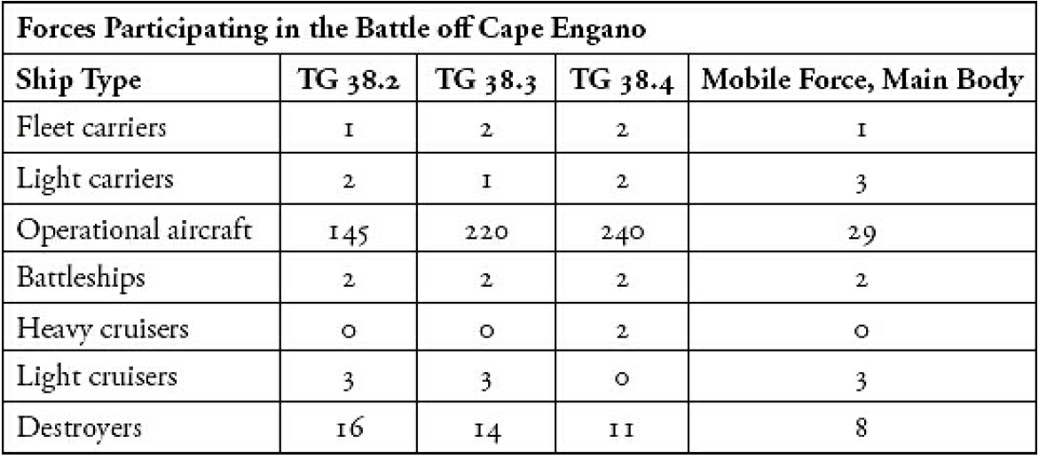 Mitscher měl s operačními svazy 38.3 a 38.4 zúčtovat se zbytkem Ózawova uskupení, zatímco na pomoc 7. loďstvu vyplul kursem 180° kontradmirál Bogan s operačním svazem 38.2, jehož jádro zahrnovalo těžkou letadlovou loď INTREPID s lehkými letadlovými loděmi CABOT a INDEPENDENCE, načež stejný úkol dostal i 34. operační svaz. Tomu velel viceadmirál Lee a momentálně sestával z bitevních lodí WASHINGTON, MASSACHUSETTS, ALABAMA, IOWA, SOUTH DAKOTA a NEW JERSEY, lehkých křižníků VINCENNES, MIAMI a BILOXI a torpédoborců OWEN, THE SULLIVANS, MILLER, HICKOX, TINGEY, HUNT, LEWIS HANCOCK a MARSHAL.