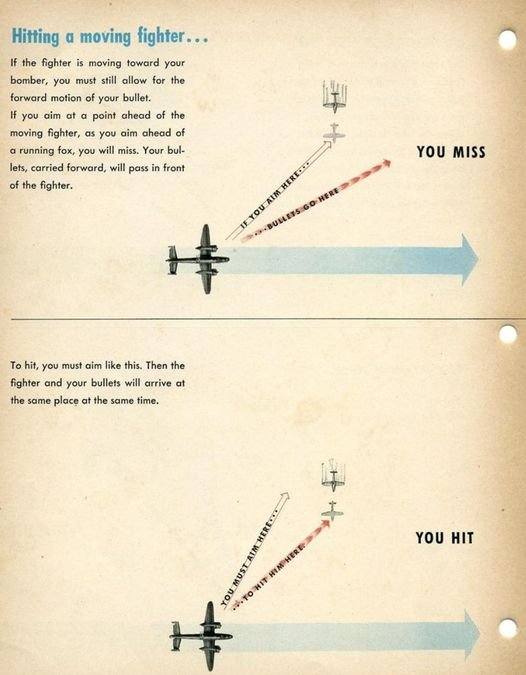 Z tréninkové příručky pro střelce bombardérů USAAF. Zatímco na zemi je střelba na pohybující cíl vedena obvykle s předsazením. Z letícího bombardéru musí střelec počítat s dopřednou rychlostí letounu a tudíž tak korigovat předsazení směrem zpět.