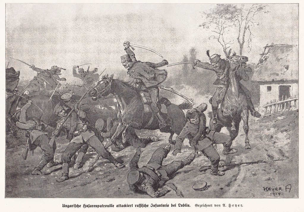Raněný vojín zaslal tento úryvek ze svého deníku: Rozvinuli jsme se v bitevní řady a stále postupovali "jako by se nechumelilo" k vesnici. Rusové měli obsazeno protější návrší a asi 1200 kroků za ním byli zakopáni. My na ně útočili z nechráněné, bažinaté prostory, kdež zapadali jsme až po pás do rašelinného bahna. Došli jsme asi 1000 kroků k osadě, když tu již zadunělo to na výšině v dáli a obláček tmavého dýmu nad levým naším řetězem označoval první ruský šrapnelový pozdrav - A po chvilce obláčky bílé i tmavé ponenáhlu se množily, vzduch vlnil se duněním a občas projel jím nad hlavou ostrý bzikot. Smrt letěla dále. Ruská artilerie střílela velmi zostra. Ovšem, je to přirozené. Byla ve vyčkávacím postavení, na domácím známém terrainu a pravděpodobně měla všechny distance přesně odměřeny. Ruský olivově zelený šat hodil se k půdě tak, že je nebylo ani viděti. Pomalu, krok za krokem postupujeme vpřed a obsazujeme první ruskou vesnici s typickým, pravoslavným kostelíkem, jehož stříbřité vížky svítily do kraje v žáru slunečním. Když dostaly se přední řady do bažin za vesnicí, začal boj puškový. Ovšem, stříleli jsme jen tam, kde jsme tušili ne- přítele, viděti nebylo nikoho. Nyní také začaly za našimi zády hovořiti naše baterie a bílé obláčky již pluly nad hlavami ne- přítele. Hned první střely ukázaly se býti účinnými. Po hodinné asi palbě Rusové zvolna opouštěli své zákopy a dávali se na ústup. Hnali jsme se nezadržitelně za nimi. Zvláště rychle postupovali jsme na levém křídle, kdež dostali jsme se Rusům v bok. Nohy bořily se do rašeliny, boty byly plné, pot potokem se lil, každý zemdlen k smrti - než stále "Ku předu!" Nadšení a vášeň, ly mocné složky, jichž výslednicí skoro vždy vítězství bývá, uchvátily nás v mocná svoje pouta: Zvítězit, dokázat svou větší zdatnost! A vzduchem chvějí nejrůznější sirény. V polovici návrší vidíme již první zraněné. Zůstávám skryt za hromadou země. Kulky bzučí a fičí nad hlavou, jako roje čmeláků. Přicházejí lehce ranění ukrýti se před střelami. Ten krvácí z nohy, ten má prostřelenou ruku, onomu utrhl šrapnel tři prsty u pravé ruky a zakrvácené cáry zavazuje do obvazu. Opodál, mezi záhony bramborů, válejí se a naříkají těžce zranění. Asi dvacet kroků od nás vydechl ruský mužík. Ústa pootevřená, údy strnule napjaty. Jiný, roztříštěnou hlavu přikloněnu maje ke hrudi, dřímá již věčný sen. V tom přiběhnou naše posily a s nimi dávám se kupředu. Kamarád vedle se nadzdvihuje a praví s humorem: "Počkej, já jim tam pošlu pár čmeláků!" Jiný, byv střelen, volá: "Už mne zobla!" - atd. Po pěti minutách se zdviháme a dosahujeme hřebenu návrší - je dobyto. Perný, krvavý to kus práce! Rusové ustoupili do vesnice v údolí a zakopali se zase na návrší protějším. Na levém křídle obsadili naši již také les, kdež měli Rusové na stromech umístěny tři strojní pušky. Mužstvo u nich bylo pobito a pušky ukořistěny. Asi dvě setniny dostávají se v bok ruské artilerii, skryté ve vesnici a zmocňují se čtyř děl, která se učinila nepotřebnými. Zatím stále naše granáty a šrapnely bzučí nám nad hlavami a bijí do ruských opevnění a kanonů. K sedmé hodině večerní utichá dělostřelecký boj a panuje střelba pušková. Zvláště strojní pušky chrlí smrtonosné střely do řad nepřátelských. Po půl hodině přestává boj docela. Jen tu a tam padne rána a pak dost. Po boji ubírají se zranění za ustavičného volání "sanitét" k obvazišti. Když dobelhali se první ranění do vesnice, kde se obvazovalo, uvítáni byli palbou zbylého obyvatelstva. Ve chvíli však tu bylo půl škadrony dragounů, záškodníci pochytáni, sami byli nuceni vykopati si hroby a pak byli zastřeleni. Vesnice, čítající přes dvě stě čísel, jim zapálena. Červená zář polila bojiště. Rusové ustoupili asi 6 km od hranic.