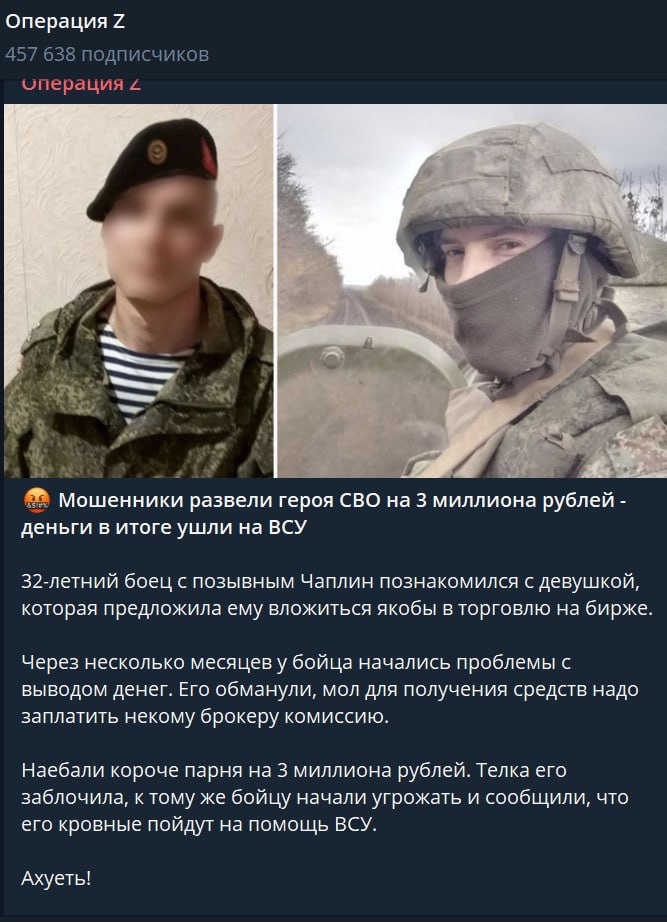 V Rusku byl "hrdina SVO" podveden o 3 miliony rublů. Později byly tyto peníze zaslány ukrajinské armádě. Dvaatřicetiletý ruský voják, volací znak "Chaplin", se setkal s dámou online. Nabídla mu, aby peníze vydělané z války na Ukrajině investoval do obchodování na burze. "Chaplin" souhlasil. Poté začal dostávat výhrůžky od neznámých lidí, kteří ho také informovali, že ukradené prostředky budou použity na darování ukrajinské armádě. "Chaplin" se již vrátil do předních linií. Kdo ví – třeba ho tam potkají zbraně koupené za jeho peníze.