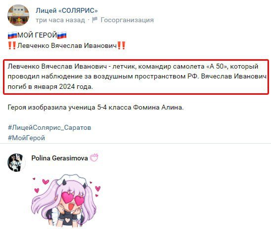 Byla potvrzena likvidace velitele letounu dálkového radarového průzkumu A-50 sestřeleného 14. ledna 2024 nad Azovským mořem. Velitel letounu podplukovník Vjačeslav Levčenko (55 let) patřil k nejzkušenějším v ruském letectvu a byl považován za "profesionála od kosti". Ruské ministerstvo obrany stále oficiálně neuznává členy posádky A-50 za mrtvé.