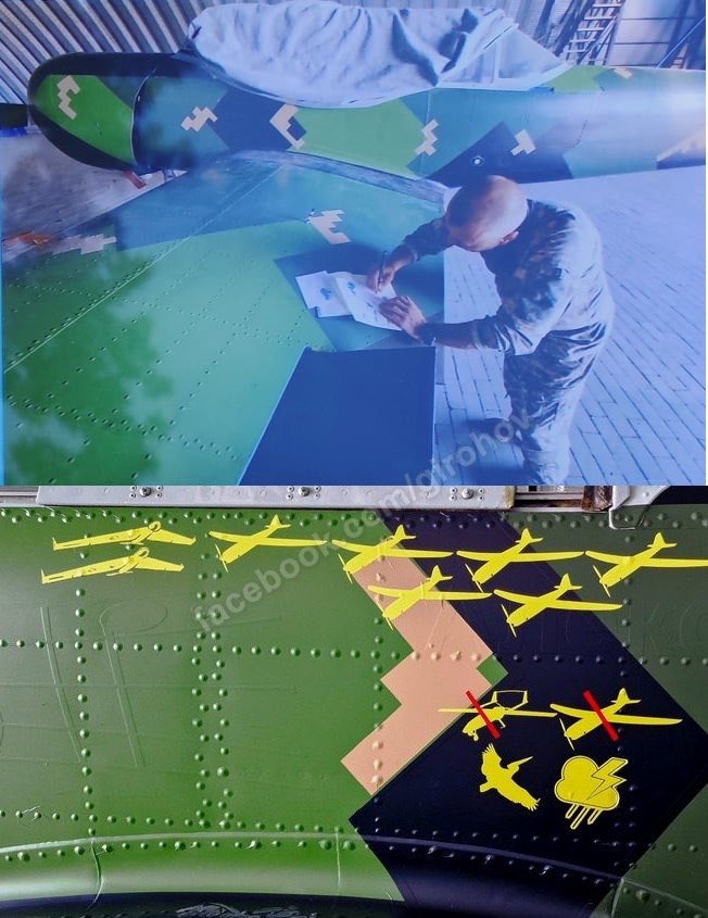 Kill marks posádky ukrajinského Jak-52, který sestřeluje ruské průzkumné drony. Pták a mrak vpravo dole označují drony sestřelené v důsledku srážky s ptákem a vystavení povětrnostním vlivům, čehož byla svědkem posádka letadla.