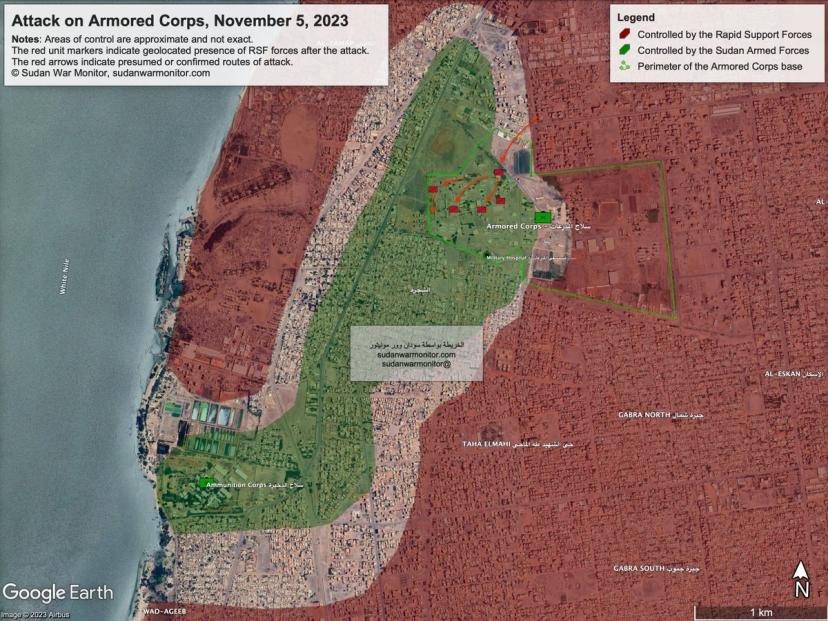Dnes RSF zaútočila na základnu obrněné jednotky SAF v jihozápadním Chartúmu. RSF již v srpnu obsadily východní části základny. Dnes ale získali víc území a dobyli většinu zbytku základny, ale na jihozápadě a v okolních čtvrtích pokračují prudké boje. Toto video (15.5454426, 32.5011460) potvrzuje, že útok RSF dosáhl daleké západní strany základny. Síly RSF operující uvnitř základny jsou však zranitelné vůči palbě odstřelovačů z obytných domů kolem ní. Na videu je vidět požár jedné takové budovy (15.543023, 32.500541).