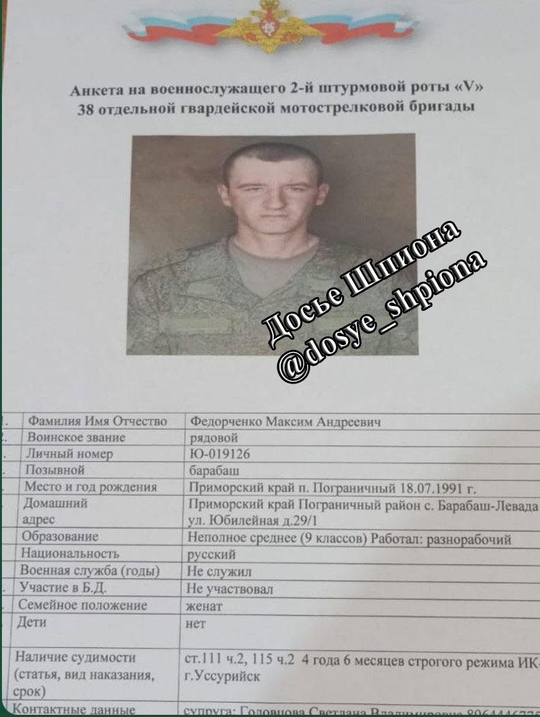Ruský voják, který je stíhán za zabití 11 spolubojovníků, je údajně opilec, zloděj a násilník, který se nechal naverbovat z vězeňské kolonie. Je pravděpodobné, že masakr byl výsledkem opilecké hádky mezi muži. Maksim Fedorčenko údajně zavolal své manželce Světlaně Golovcovové poté, co provedl masakr v noci na 26. října 2024, a přiznal se k vraždám. Říká se, že hodil granát a zahájil palbu na muže, když spali v zemljance. Všichni na místě zemřeli. Předchozí den také volal a řekl své ženě, že dal peníze svému spolubojovníkovi a krajanovi s volacím znakem "Stary", aby si mohl zajít do obchodu pro chlast. Podle Světlany má její manžel sklony k pití. Maxim Fedorčenko je ve své rodné vesnici v Přimorském kraji odmala známý jako piják a zloděj, kterého dokonce přistihli při krádeži jídla. Naposledy skončil ve vězení, když se opilý vrátil z práce (on i Světlana pracovali na pile) a napadl svou ženu. Jak se později ukázalo, důvodem agrese bylo, že bezdůvodně žárlil na ženinu sousedku a napadl ji. Maxim Fedorčenko polil Světlanu vařící vodou a čtyřikrát ji bodl, za což byl odsouzen na 4 roky a 6 let. Z vězeňské kolonie, kam oběť nadále posílala balíky svému nešťastnému manželovi, narukoval do války a skončil v útočné rotě "Storm V". Nebylo by to poprvé (byť je tohle možná nejsmrtelnější případ), kdy pití nebo drogy vedly k násilí. Zneužívání alkoholu a drog je mezi ruskými jednotkami údajně rozšířené, přičemž tvrdé drogy jsou snadno dostupné u sítě dealerů.