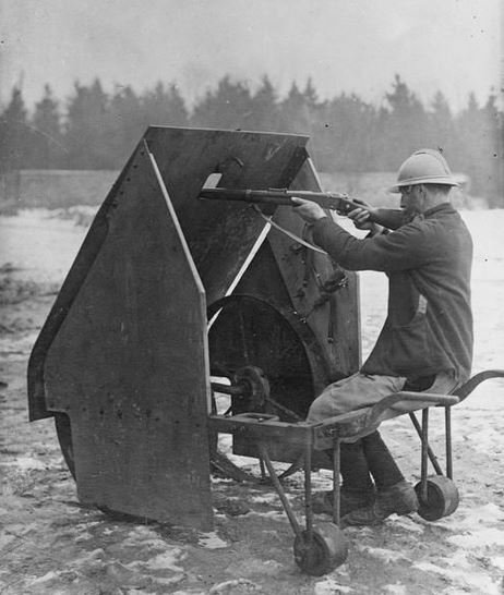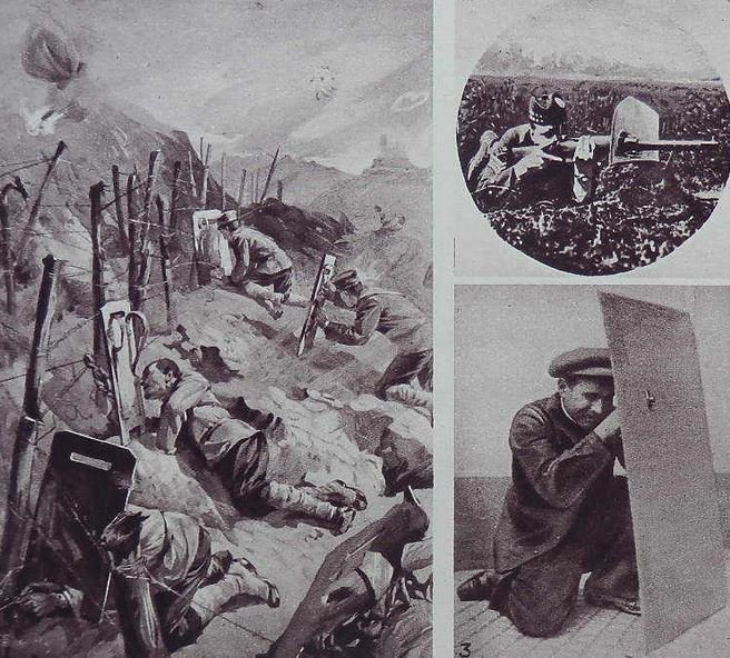 Parádní fotografie již těžších mobilních štítů. Nahoře můžeme vidět na německé pohlednici ukořistěný ruský mobilní štít. Zmíním, že s podobnými vyrazili do první světové války rovněž němečtí vojáci. Paradoxem ale je, že byly natolik těžké pro přepravu, že jim pěšáci, při počátečních manévrových bojích, jednoduše "utekli". Brzy již byla ocel potřeba jinde a tak tyto nevyužité kolosy putovali do hutí. Níže pak všelijaké podivnosti.
