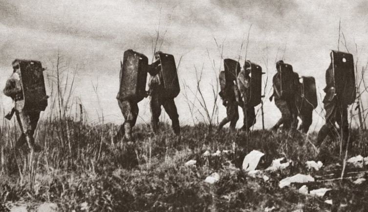 Nemecký zákopový štít - fotka z "manévrov", zrejme z predvojnového obdobia, dokazuje, že označenie odkazujúce na rok 1916 je zrejme nepresné a štít bol zavedený už skôr