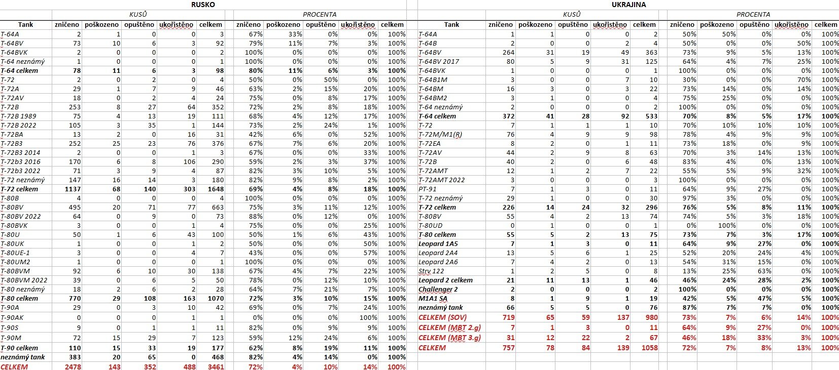 Současně jsem si říkal, jestli by jejich analýzy mohla něco naznačit o tom, jak je na tom technika v rámci schopnosti přežití na bojišti. Vzal jsme to po typech. Neznámé tanky jsem nezařadil do samostatné kategorie, protože není jasné, o jaký tank se jednalo, ale zařadil jsem je do celkové statistiky. U Ukrajiny jsem je potom zařadil k sovětským tankům, protože západní MBT v řadách Ukrajiny jsou pečlivě sledovány a není jich tolik, jako těch ex sovětských a tedy je šance, že budou mezi nimi prakticky nulová.