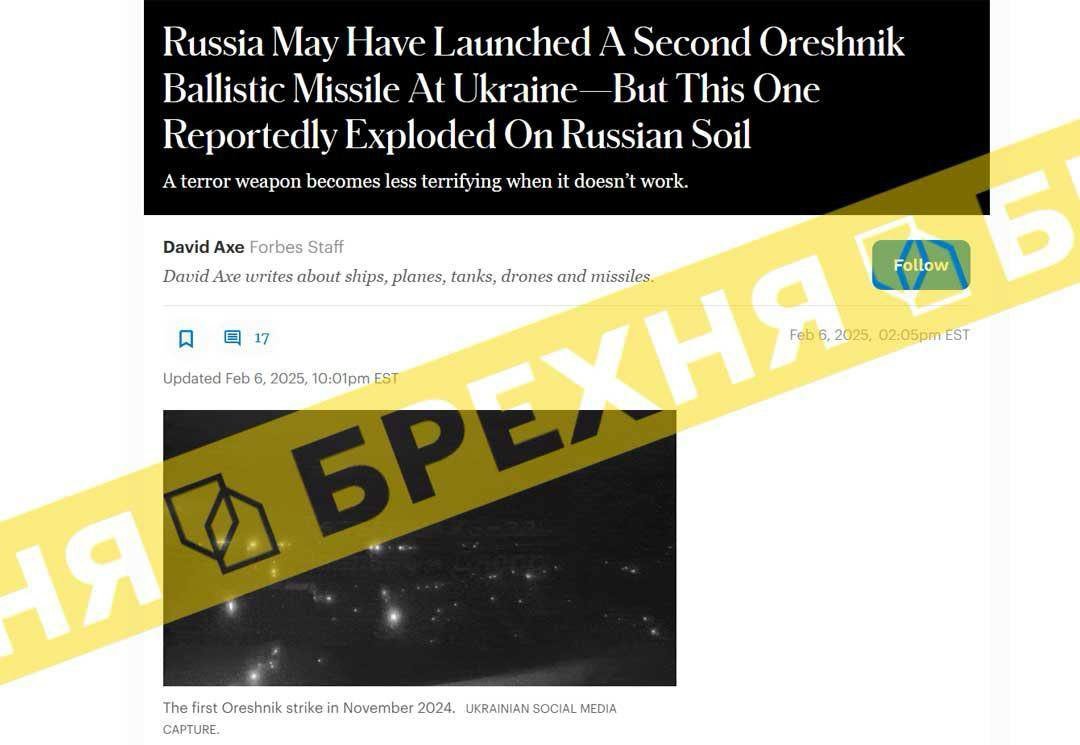 Aktualizace, 7.2.25, 8:36 EST: Centrum pro boj proti dezinformacím ukrajinské Rady národní bezpečnosti a obrany oznámilo, že ve čtvrtek nedošlo k žádnému odpálení rakety Orešnik.