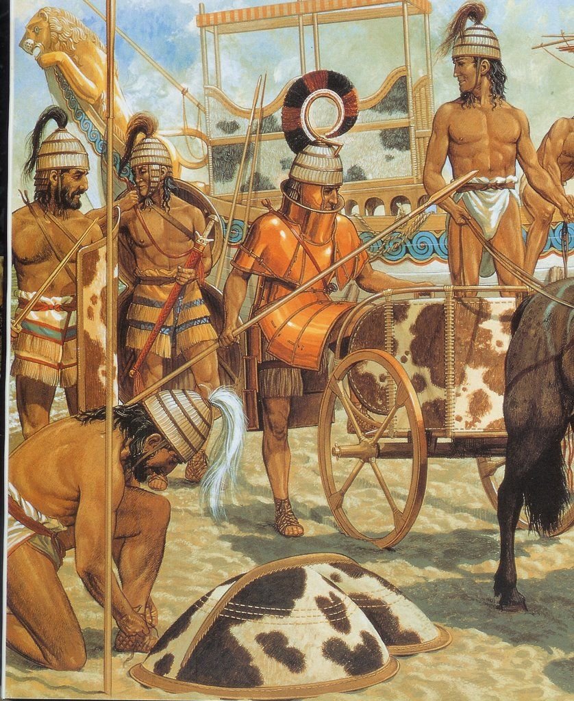 Ja by som to skôr chapal ako "ozdobu" vojvodcu stojacho na bojovom voze, aby bol viditelny z dialky pre svojich bojovníkov a zaroven kedže bol v zadnych radoch aby bol nezranitel pred šípmi a kamennymi projektylmi. Ozajstvy boj pravdepodone prebiehal tak ako je vyobrazene na "bojovom achate z Pylu, ktory pochadza z rovnakeho mykenskeho obdobia.