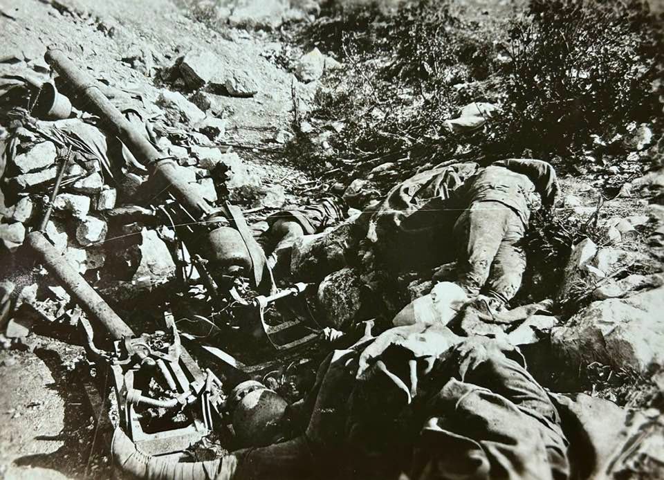 Tohle vypadá na rozbité postavení rakousko-uherských pneumatických minometů - snad 12 cm Luftminenwerfer (na fotografiích níže).