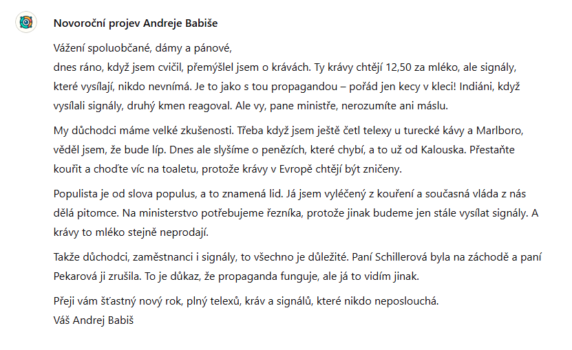 https://x.com/Posledniskaut/status/1874508165817242067Nechal jsem AI podle loňských vystoupení Andreje Babiše ve Sněmovně vygenerovat jeho krátký novoroční projev.