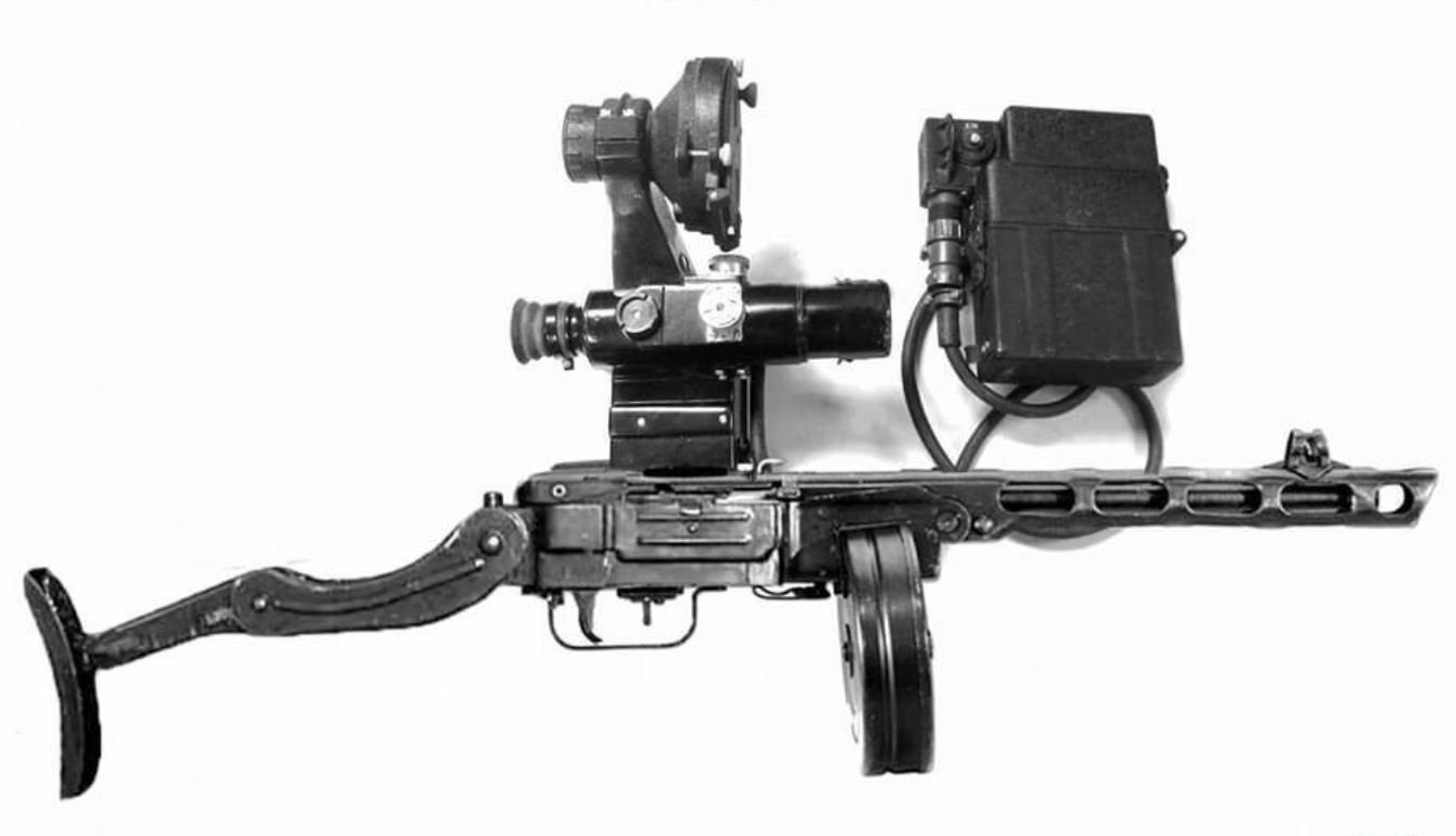 PPŠ-41 se skládací pažbou a experimentálním zaměřovačem pro noční vidění.
