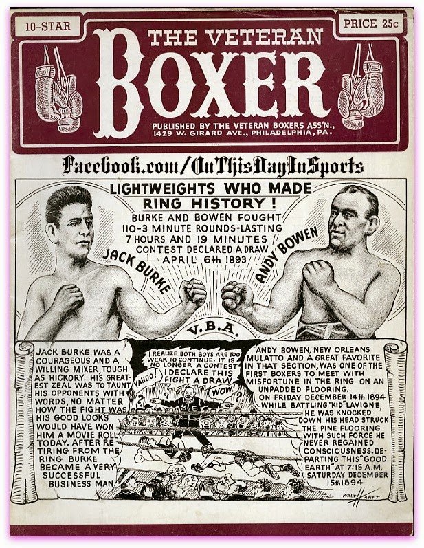 Zavřete oči a představte si souboj dvou profesionálních boxerů lehké váhy. Píše se 6. duben 1893 a v New Orleans se proti sobě postavili Andy Bowen a "Texas" Jack Burke. Po několika hodinách boje již někteří diváci v hledišti usnuli. Burke měl zlámáno mnoho kostí na zápěstí, přesto zápas neúnavně pokračoval dál. Ve 108. kole rozhodčí John Duffy oznámil, že pokud se během následujících dvou kol neobjeví vítěz, zápas bude ukončen bez výsledku, což se nakonec stalo. Ani jeden z vyčerpaných boxerů totiž již nebyl schopen pokračovat a ani jeden se nedokázal zvednout ze stoličky, aby zahájili 111. kolo. Po neuvěřitelných 7 hodinách a 19 minutách tak byl zápas prohlášen za "no contest" (bez výsledku). Zapsal se tak do historie jako nejdelší boxerský souboj všech dob a je připomínán jako důkaz neuvěřitelného odhodlání obou boxerů.