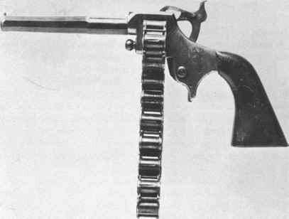 Začátkem roku 1866 si nechal Američan Henry S. Josselyn patentovat revolver s řetězovým zásobníkem na 20 nábojů. Náboje malé ráže se vkládaly do jednotlivých komor a posun řetězu byl synchronizován s úderníkem. Patent je veden pod číslem 52248. Zbraň byla značně nepohodlná, jelikož dlouhý řetěz visící pod hlavní vážil odhadem minimálně jeden a půl kilogramu. Prodejně tak šlo o absolutní propadák. Zajímavostí je, že nešlo o první zbraň s řetězovým zásobníkem. Tu si totiž nechal roku 1855 patentovat anglický puškař jménem Tribi (Treeby). Tato puška ráže 0,54 palce (cca 13 mm) ještě nebyla určena pro střelbu jednotnou municí, která se teprve začínala používat. Střelec musel nasypat odměřené dávky střelného prachu do nabíjecích komor, vložil ucpávky a náboje, načež ze zadní strany nasadila kapsle s roznětkou. Řetěz se otáčel spolu s úderníkem, ale před výstřelem bylo nutné domáčknout hlaveň pomocí speciální páky. Zásoba munice činila 14 ran, ale prý existovala i verze na 30, ta se ale nedochovala. Tribi nabídl svou pušku britské armádě, ale ta ji považovala za příliš těžkou a nepohodlnou, navíc též příliš drahou a komplikovanou. Stejně tak civilní trh o zbraň neprojevil zájem a tak vzniklo jen několik prototypů, z nichž dva se dochovaly dodnes. Jeden je uložen v muzeu hrabství Hampshire ve městě Winchester a druhý je v soukromé sbírce. Možná překvapí, že ve 20. letech 20. století někdo v SSSR zkonstruoval pistoli s řetězovým zásobníkem na 36 nábojů. Autor a ani okolnosti vzniku nejsou známy. Zbraň je uložena v muzeu zbraní v Tule.
