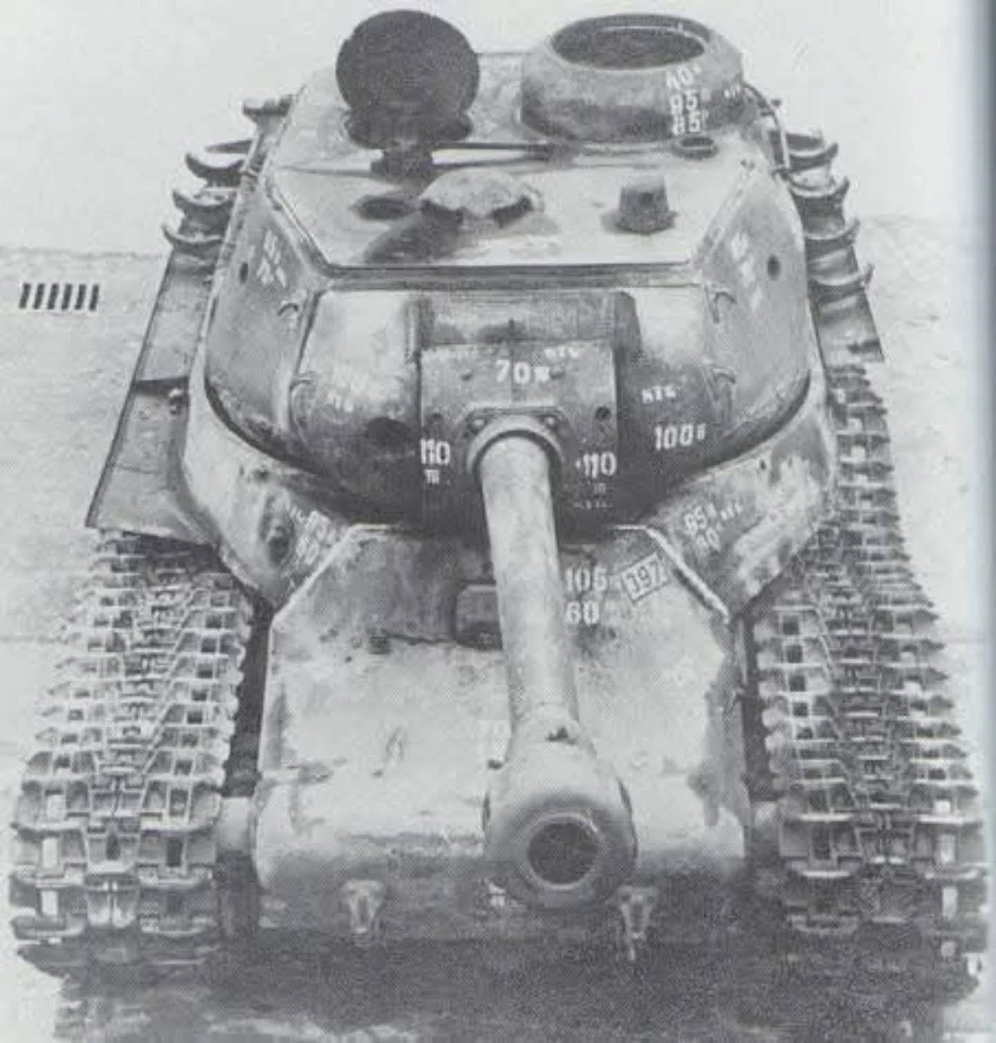 Sovětský těžký tank IS-2 ukořistěný Němci. Bílá čísla značí silu pancíře. Cvičiště Kummersdorf roku 1944.