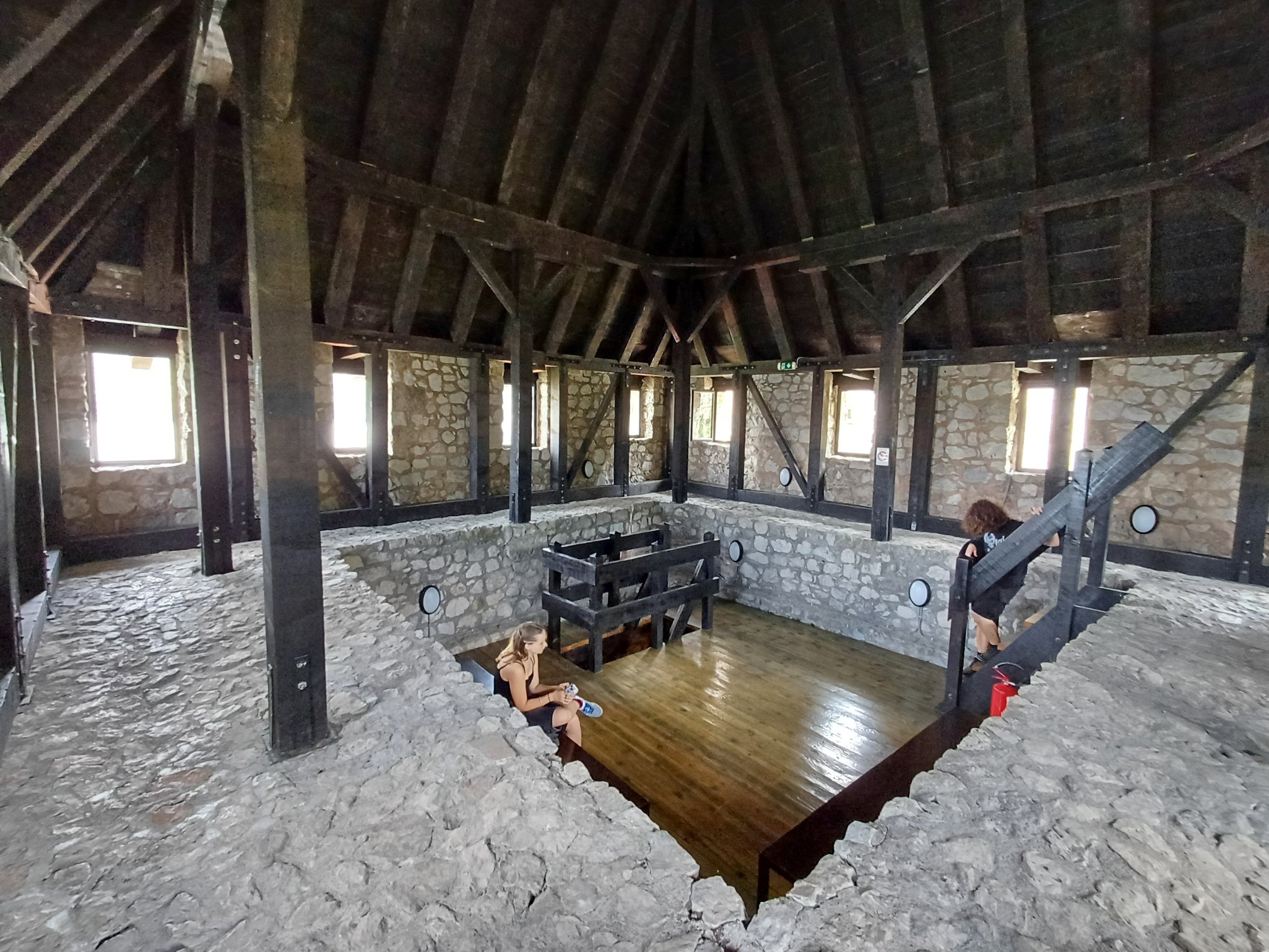 Pro stavbu středověkého hradu byl vybrán skalnatý hřebem nad Dunajem. Na nejchráněnějším a nejvyšším místě byla postavena hlavní věž. Ne zcela pravidelná šestiboká stavba byla v cca dvou třetinách své výšky ukončena cimbuřím a z plošiny uprostřed pokračovala výrazně užší okrouhlá věž, s čtverhranným vnitřním prostorem. Její poslední patro jemně přečnívá nižší úrovně, není ale vysazeno na krakorcích. Celek je známý jako Šešir kula – Čepicová věž (1). Tradičně označovaná jako donjon. Já tam tedy moc prostoru pro bydlení nevidím, ale budiž. Vstup byl veden ze severní, nejvíce chráněné strany po skalnatém hřebeni v úrovni přízemí. Odtud stoupalo schodiště v síle zdi do vyššího patra, odkud vyrůstala ona okrouhlá nástavba. Jak vypadala nižší patra věže nevíme, oproti vstupu směrem do nádvoří mohla mít tak 3-4 „suterénní“ podlaží. Nezachovali se ale náznaky žádných otvorů, oken, střílen. Okrouhlá část má poměrně malý vnitřní prostor 2,5x2,5 m se schodištěm opět v síle zdi. Jak tedy tento donjon vypadal v době svého vzniku nejsme schopni určit. Cesta k věži je na videu na konci článku.