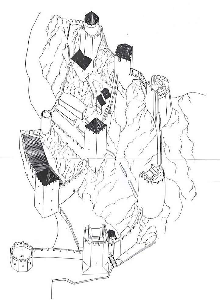 Pro stavbu středověkého hradu byl vybrán skalnatý hřebem nad Dunajem. Na nejchráněnějším a nejvyšším místě byla postavena hlavní věž. Ne zcela pravidelná šestiboká stavba byla v cca dvou třetinách své výšky ukončena cimbuřím a z plošiny uprostřed pokračovala výrazně užší okrouhlá věž, s čtverhranným vnitřním prostorem. Její poslední patro jemně přečnívá nižší úrovně, není ale vysazeno na krakorcích. Celek je známý jako Šešir kula – Čepicová věž (1). Tradičně označovaná jako donjon. Já tam tedy moc prostoru pro bydlení nevidím, ale budiž. Vstup byl veden ze severní, nejvíce chráněné strany po skalnatém hřebeni v úrovni přízemí. Odtud stoupalo schodiště v síle zdi do vyššího patra, odkud vyrůstala ona okrouhlá nástavba. Jak vypadala nižší patra věže nevíme, oproti vstupu směrem do nádvoří mohla mít tak 3-4 „suterénní“ podlaží. Nezachovali se ale náznaky žádných otvorů, oken, střílen. Okrouhlá část má poměrně malý vnitřní prostor 2,5x2,5 m se schodištěm opět v síle zdi. Jak tedy tento donjon vypadal v době svého vzniku nejsme schopni určit. Cesta k věži je na videu na konci článku.