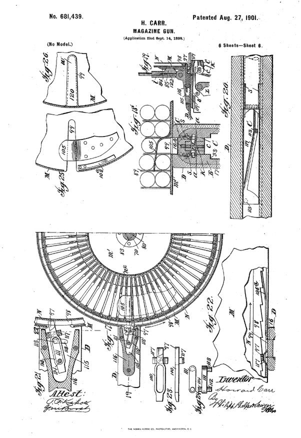 Na počátku 20. století, vznikl velice zajímavý kulomet který zkonstruoval Howard Carr ze San Franciska. Dne 14. dubna 1901, přišla na úřad námořnictva žádost o zkoušku nového kulometu. Žádost pocházel od společnosti Driggs-Seabury Gun and Ammunition Co., z New Yorku se sídlem na ulici Cedar Street 43. Vzhledem k tomu, že námořnictvo zbraň nepoptávalo a jednalo se o soukromou iniciativu podniku, bylo dohodnuto, že vláda sice poskytne munici na zkoušky, ale zaplatí ji výrobce zbraně. Zbraň byla komorována na náboj Krag–Jørgensen ráže .30 (7,62 mm). Tehdy se jednalo o první náboje plněné bezdýmým střelným prachem, zavedené americkou armádou. Pušky Krag–Jørgensen se v USA vyráběly v letech 1894 až 1904 ve zbrojovce Springfield v Massachusetts. Vyrobeno zde bylo zhruba půl milionu těchto zbraní a jednalo se o standardní zbraň americké námořní pěchoty té doby. Testovaná zbraň byla namontována na opěrce vybavené sedátkem pro obsluhu. Hlavní bylo možno vertikálně pohybovat pomocí šroubového závitu. Munice byla byla uložena v bubnovém zásobníku. ten byl rozdělen na 62 částí, v každé byly uloženy nad sebou čtyři náboje. Celkem tedy zásobník pojal 248 kusů munice. Výrobce ke zbrani přinesl i druhý zásobník na 310 ran, rozdělený na 5 částí. Pokud jde o samotný bubnový zásobník, tak s tímto konceptem přišel již Hiram Maxim, ale teprve Howard Carr se je poprvé pokoušel prakticky využít. Vlastní konstrukci zásobníku vyrobil v roce 1898 a nechal patentovat v roce 1901. Během vojskových zkoušek bylo prokázáno, že jednomu vojáku zabere doplnění munice do zásobníku 4 minuty a 45 sekund. Obsluhy testovaného kulometu se ujal samotný konstruktér a pro úvodní ukázku činnosti zbraně, vypálil 20 jednotlivých dávek a 20 ran dávkou. V této části zkoušek zbraň fungovala zcela bezchybně. Pro ukázku, jak rychle je možno zbraň sestavit v polních podmínkách, byl tento úkon zvládnut za 40 sekund. Dále bylo jednotlivě vystřeleno 17 kusů munice a 50 kusů dávkou. Během těchto zkoušek došlo k malé závadě pro ověření kvality munice, muselo být z pistole Colt vypáleno 100 kusů munice. Zkouška prokázala, že závada byla v samotném kulometu. Střelec ale závadu velice rychle opravil a dokázal zbraň rozebrat bez použití nástrojů. Vojáci požadovali zkušební vypálení 1 000 ran, což ale představovalo problém, jelikož hlaveň postrádala vodní chladící válec, který by umožnil takto vytrvalou střelbu. Výrobce požádal o odklad, než tyto problémy vyřeší. Druhá fáze testů byla zahájena 25. července 1901. Střelecké zkoušky nyní probíhaly uspokojivě. Za 35 sekund bylo vystřeleno 192 ran a za 40 sekund 240 nábojů. Kadence tedy byla vypočtena na 360 ran/min. Při zkouškách vytrvalé střelby, ale docházelo k přerušením tak často, že zkoušku nebylo možno uspokojivě dokončit. Problémem se ukázala být slabá pružina v zásobníku, která nedokázala efektivně vytlačit všechny náboje z bubnu. Projevily se i různé další problémy s odpalem munice. Pokud zbraň nebyla připevněna k držáku, těžký zásobník způsoboval, že bylo komplikované zacílit terč a zbraň byla považována za neohrabanou. Přehřívání při vytrvalé střelbě rovněž způsobilo, že ovládací mechanismus se zpomaloval a zasekával. Vedoucí důstojník - poručík Francis Broughton zhodnotil, že zbraň neprokázala požadované nároky na spolehlivost a zkoušku ukončil. Historie si tak musela na kulomet s plnohodnotným bubnovým zásobníkem několik let počkat, než byl představen lehký kulomet Lewis.