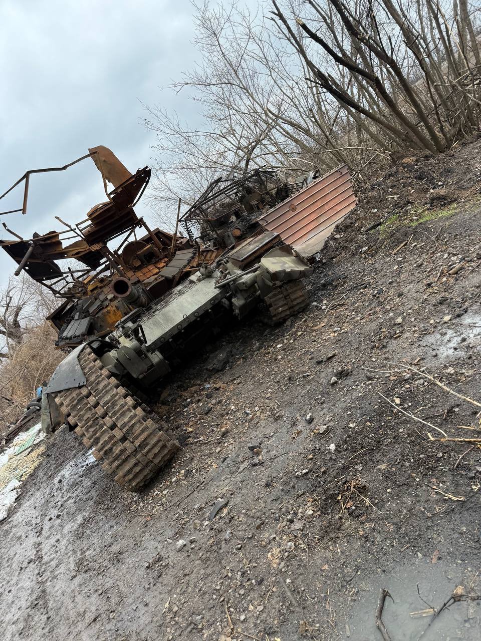 Zničený ruský tank T-80BVM a BMP-2 ve směru na Pokrovsk.