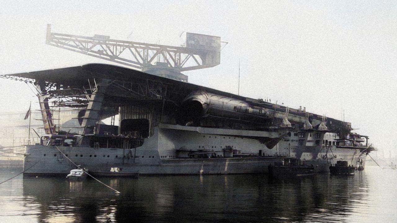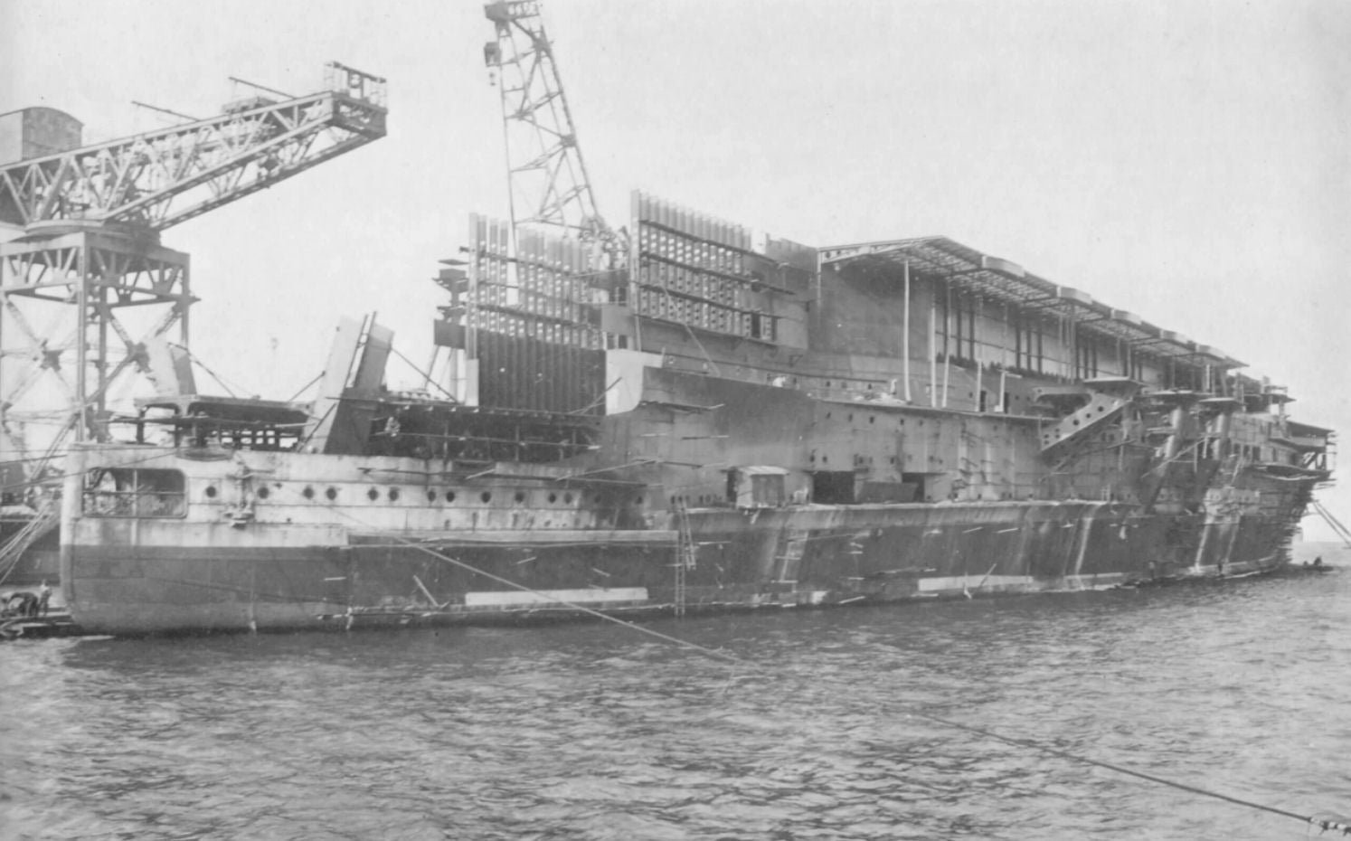 Horní část s letovou palubou z větší části chybí, ale je vidět dobře trup lodi a části pokrouceného hangáru.