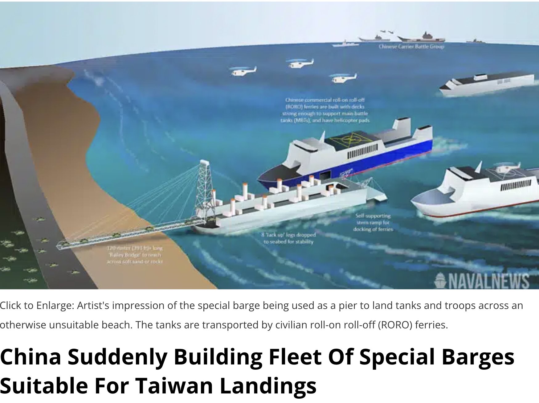 Osobně se docela divím, že nemají nějaké betonové "plovoucí mola", jako Spojenci při vylodění v Normandii. Tedy něco co potopí na místě určení a pak využijí jako přístavní molo. Přeci jen to nejde potopit a prakticky ani zničit. Tady ta loď s mostem je sice pohyblivější a levnější, ale taky dost "vachrlatá". Na nezbytné zametení pobřeží Čína nemá kapacity a ani mít nebude - vždycky nějaký obránce přežije. Pořád si ale myslím, že celé to čínské chrastění zbraněma je jen taková "šaráda" a reálnou invazi ani v plánu nemají. Byť se o to snaží jak to jen jde - zkrátka aby se Tchajwanci a Američané sesypali a obranu předem vzdali.