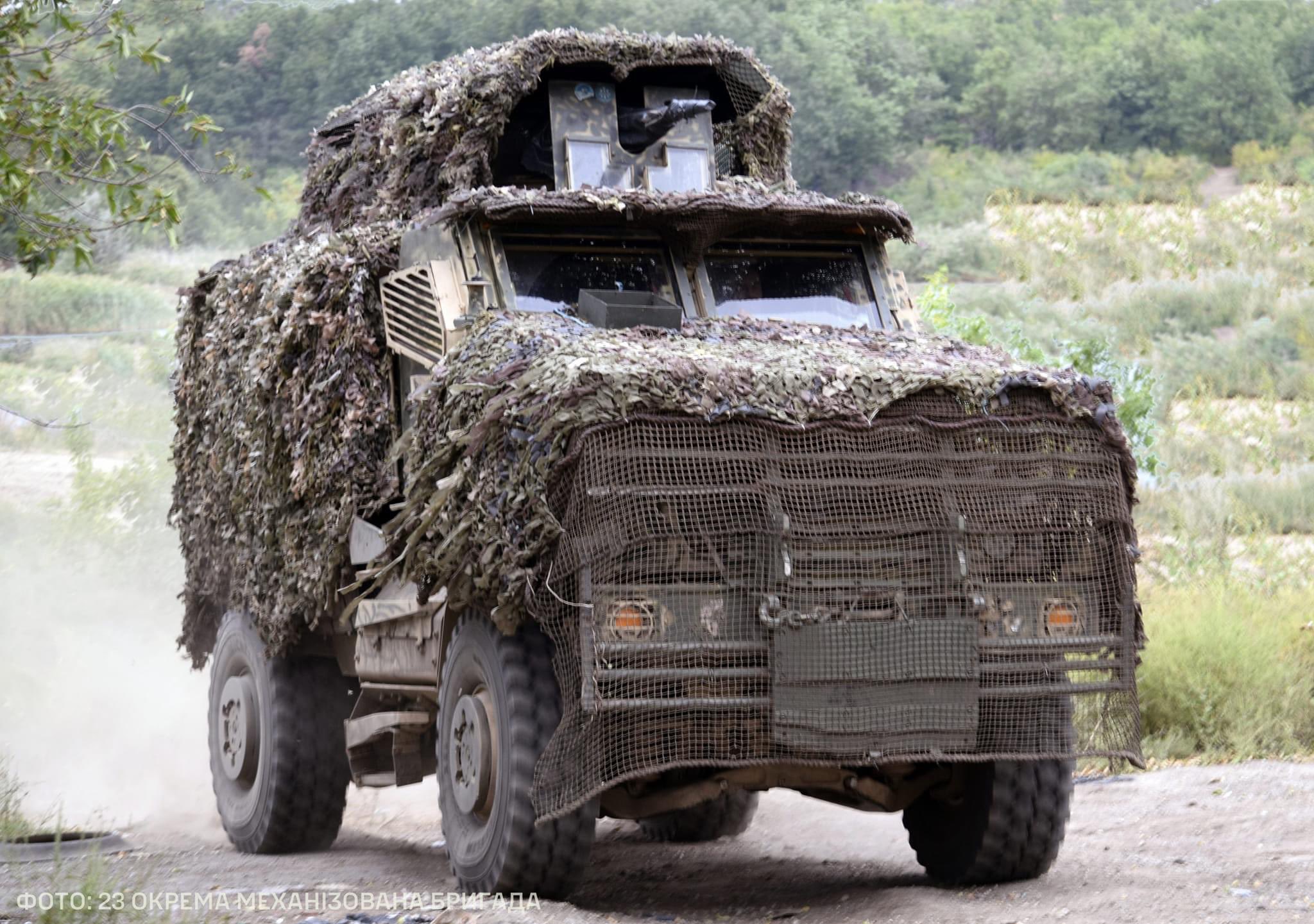 Ukrajinský International M1235 MaxxPro Dash MRAP s improvizovanou kamufláží, maskovacími sítěmi a podobně. Na kapotě je také držák na rušičku (EW). Provozuje jej 23. samostatná mechanizovaná brigáda, poblíž Časiv Jar v Doněcké oblasti.