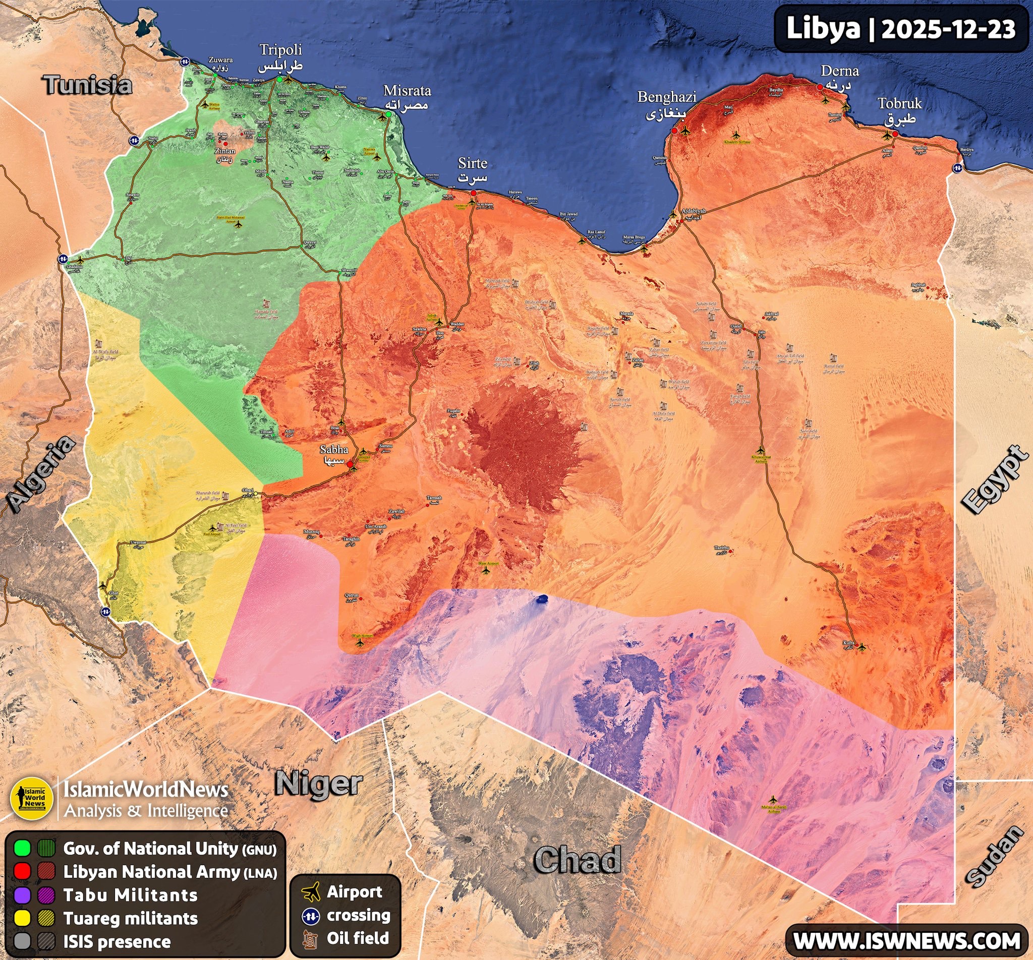 Zůstávají dva rivalové – Haftarova LNA v Tobruku podporovaná Egyptem/SAE a Dbeibahova GNU v Tripolisu podporovaná Tureckem. Léta po Kaddáfího pádu a krvavých bojích zůstává Libye pohlcena vnitřními spory/roztříštěností a nemá jasnou vyhlídku do budoucna.