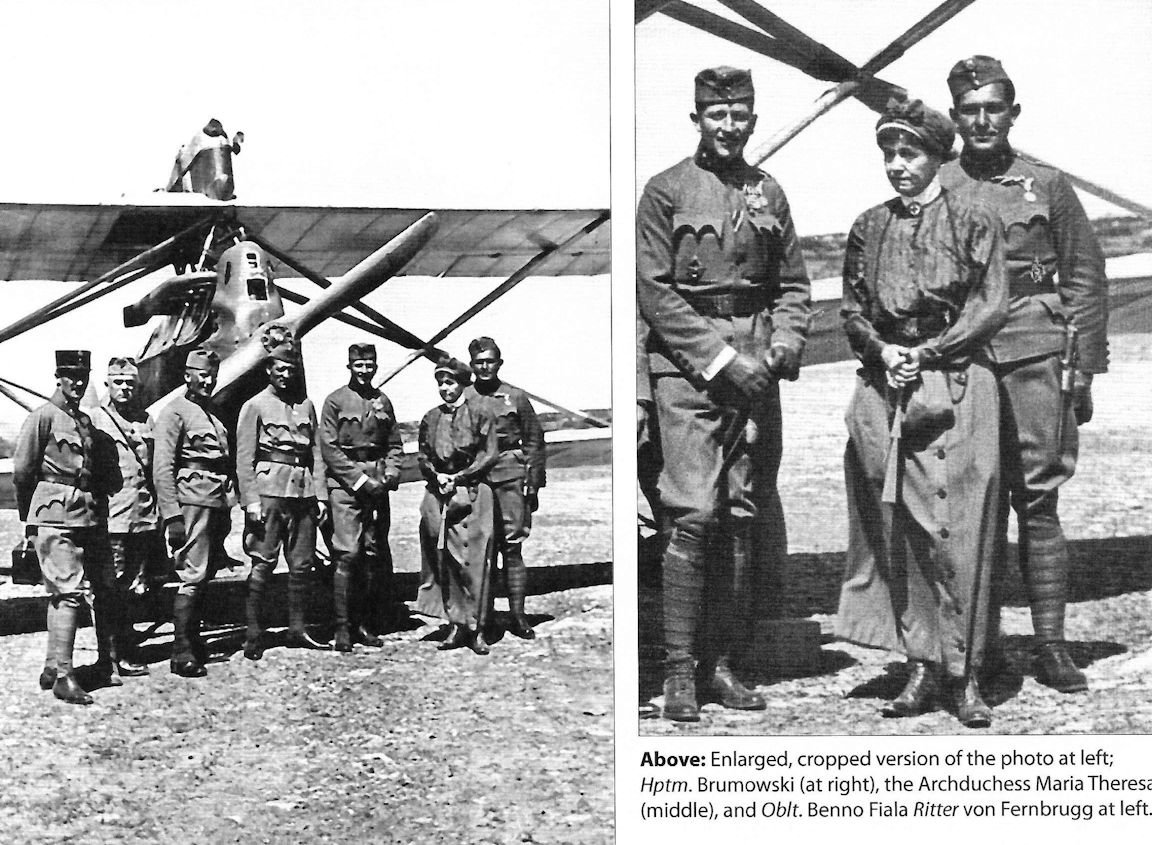 Zprava, Hptm. Brumowski, Oblt. Benno Fiala Ritter von Fernbrugg a arcivévodkyně Marie Terezie při návštěvě Flik 41/J 26. července 1917 v Sezaně. Druhá žena, zřejmě zdravotní sestra, bohužel není známa, stejně jako nejsou známy identifikace čtyř mužů vlevo.