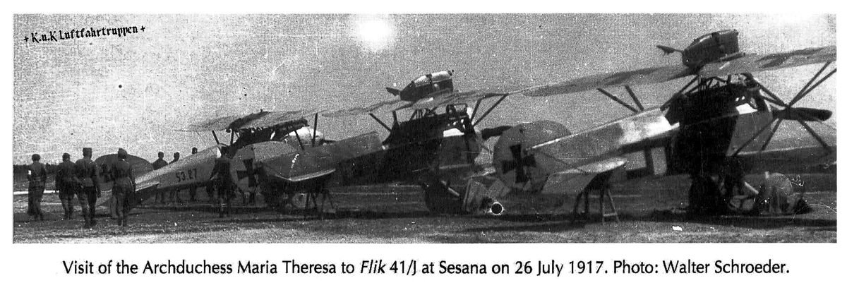 Popisek všech fotografií určuje přesný datum a místo, 26.červenec 1917 Sesana. Předpokládám, že návštěva arcikněžny musela být pro oficíry a jednotku událost, jak návštěva baronky v nemocnici u Švejka :D. Prostě obrovská událost, našly by se někde dobové záznamy z této události nebo víc fotek? Nebo seznam letuschopných strojů u Flik 41J k tomuto datu? To běžně v leteckých publikacích o této době není..