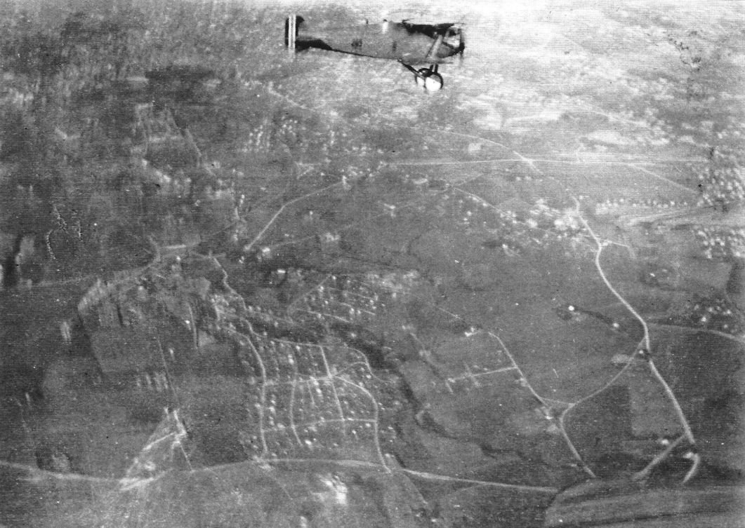Fotografie zachycuje letoun Albatros C.I rakousko-uherského letectva během průzkumného letu nad obcí Liběšice v roce 1916, v období první světové války.