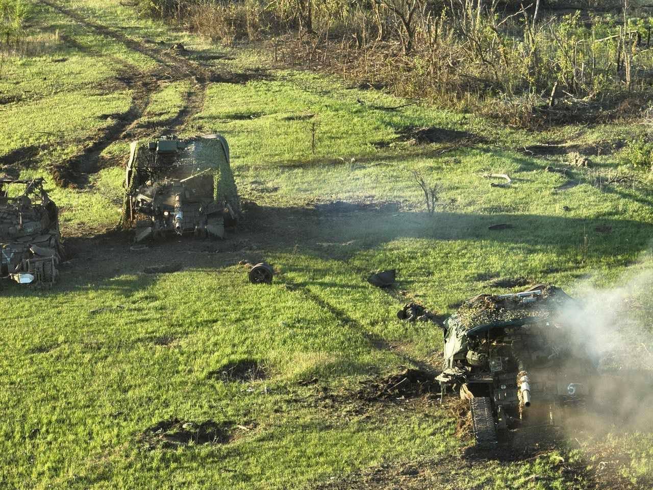 Kolona ruských tanků T-62 a opravárenského BTS-4. Vzhledem k tomu jak jsou zakrytí ochrannými sítěmi patrně plní roli palebné podpory místo houfnic. Minimálně jeden T-62 by totiž nedokázal ani otočit věží.
