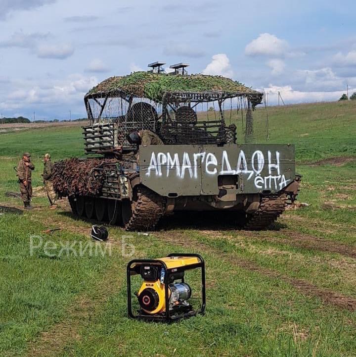 Ruský T-62M s generátorem, který pravděpodobně napájí rušičku dronu na horní části protidronové klece. Rusové si tank ozdobili přezdívkou “Armagedon”.