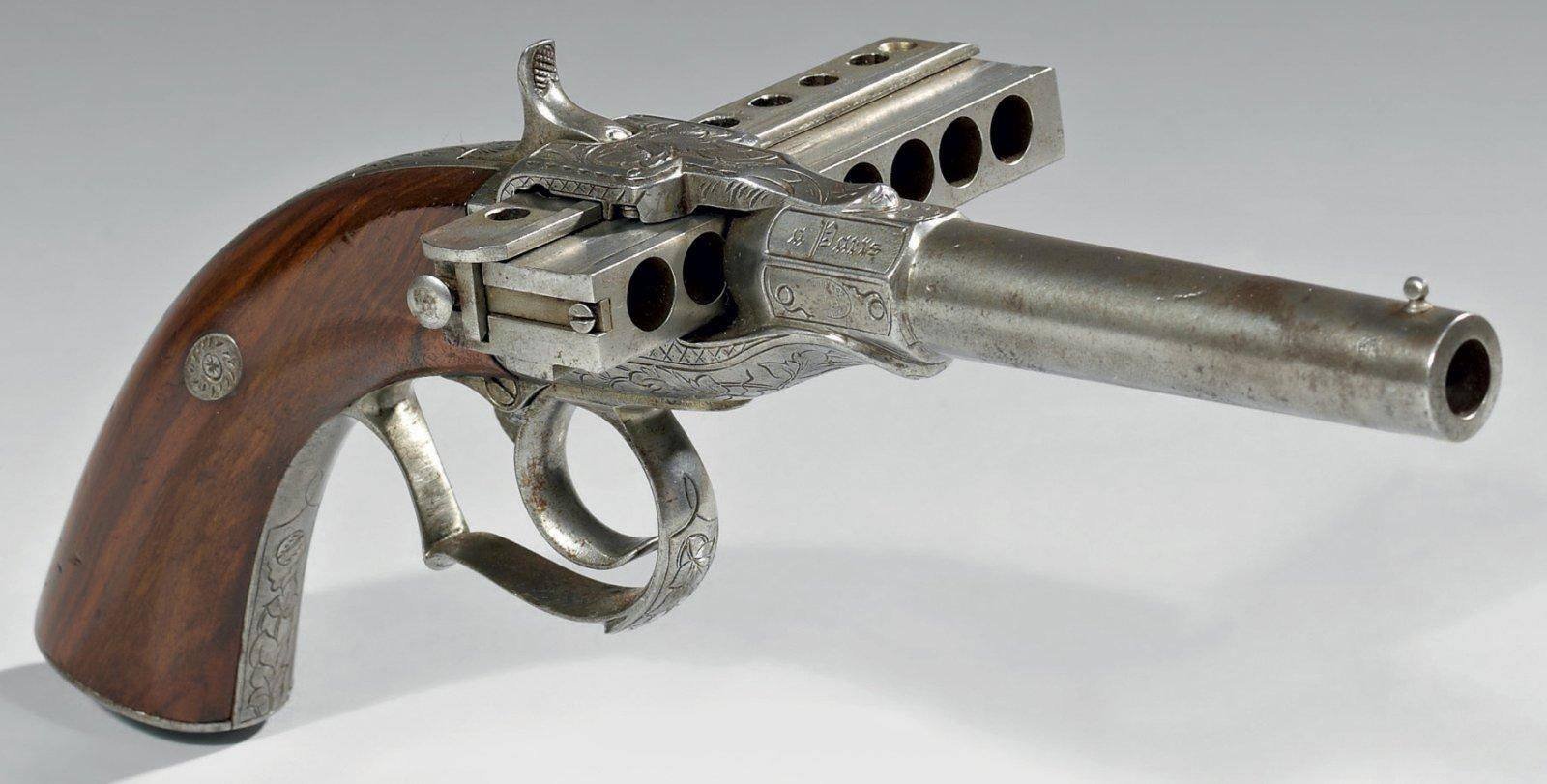 V polovině 19. století, zhruba mezi lety 1859 a 1862, obdržel francouzský vynálezce A.E. Jarre několik patentů na velmi neobvyklý design zbraní. Nejzajímavější je nepochybně Harmoniková pistole s horizontálním zásobníkem, známá též jako Harmonica Jarre. Vznikly dva hlavní odlišné typy. První měl zásobník uložený uvnitř rámu zbraně a vyznačuje se jedinou hlavní, druhý sestával z pohyblivého zásobníku, postrádající jednotnou hlaveň. Vnikly rovněž různé verze pro 6 až 10 nábojů, ale i s různými rážemi, konkrétně 7 až 9 mm. Pistole využívala náboje typu "Lefaucheux" s kolíčkovou zápalkou z boku patrony, která byla díky své složitosti velmi nespolehlivá a náchylná k náhodnému odpálení. V případě odejmutého zásobníku byla zbraň velmi kompaktní, ale během střelby byl horizontální zásobník velmi rozměrný a při střelbě velmi špatně ovlivňoval přesnost. Na závěr dodejme, že podobné harmonikové zbraně vytvořil již v roce 1742 švýcarský vynálezce Welten, ale nikdy se víc nerozšířily. Ještě zmíním, že jeden z exemplářů Jarreho harmonikové pistole, i s originálním pouzdrem a příslušenstvím, byl prodán za více než 10 000 dolarů (téměř čtvrt milionu Kč).