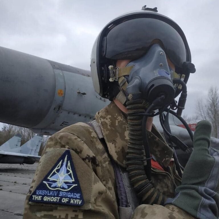 Pilot 40. BrTA ze základny Vasylkiv hrdě předvádí nášivku se jménem "Ghost of Kyiv", které si jednotka vysloužila v tvrdých bojích s ruskými agresory. Migy-29 v pozadí nesou starou kamufláž a zřejmě nejsou letuschopné. Na stojánce, tak mohly sloužit jako případná návnada pro ruské útoky, aby tak uchránily provozuschopné Migy, které byly naopak rozptýleny z hlavních základen na záložní letiště a improvizované plochy (včetně silničních úseků).