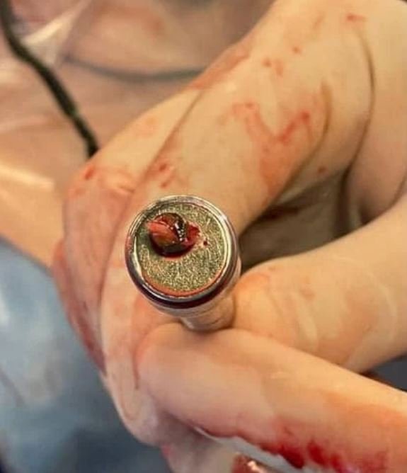 Ukrajinští chirurgové se pochlubili úspěšnou operací, kdy uměle zastavili srdce vojákovi a napojili ho na mimotělní oběh, aby mu ze srdce mohli pomocí silného magnetu vytáhnout malý kousek střepiny z miny. Vojenští lékaři úspěšně operovali vojáka, kterému během bojových operací v Doněcké oblasti uvízl úlomek miny v srdci. Informovalo o tom velitelství zdravotnických jednotek ukrajinských ozbrojených sil. Chirurgové zachránili vojáka (33 let), který 24. října utrpěl zranění při výbuchu miny, během bojů v Doněcké oblasti. V oblasti jeho srdce bylo detekováno cizí těleso s kovovou hustotou o rozměrech 7x6x5,5 mm. Vojenští chirurgové stabilizovali stav pacienta a poslali jej na kliniku Amosova ústavu kardiovaskulární chirurgie, kde byl tři dny připravován k operaci. Lékaři tvrdí, že střepina byla v mezikomorové membráně, situované velmi blízko chlopní, takže musela být neprodleně odstraněna. Operace byla provedena za podmínek umělého krevního oběhu, to znamená, že srdce muselo být zcela zastaveno. Kovový fragment byl odstraněn díky inovativní technice – neodymovému magnetu. "Tuto metodu jsme vyvinuli společně s civilními lékaři a zachránili jsme životy již 96 vojákům," zdůraznili lékaři.