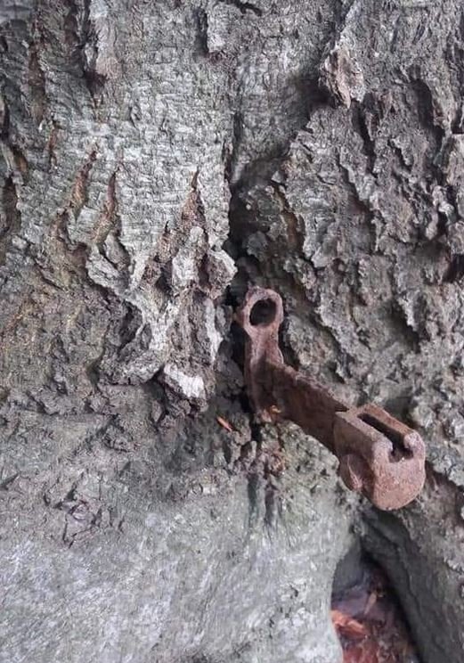 Pěkný artefakt z první světové války. Bodák zarostlý ve stromě, kdesi v Srbsku.