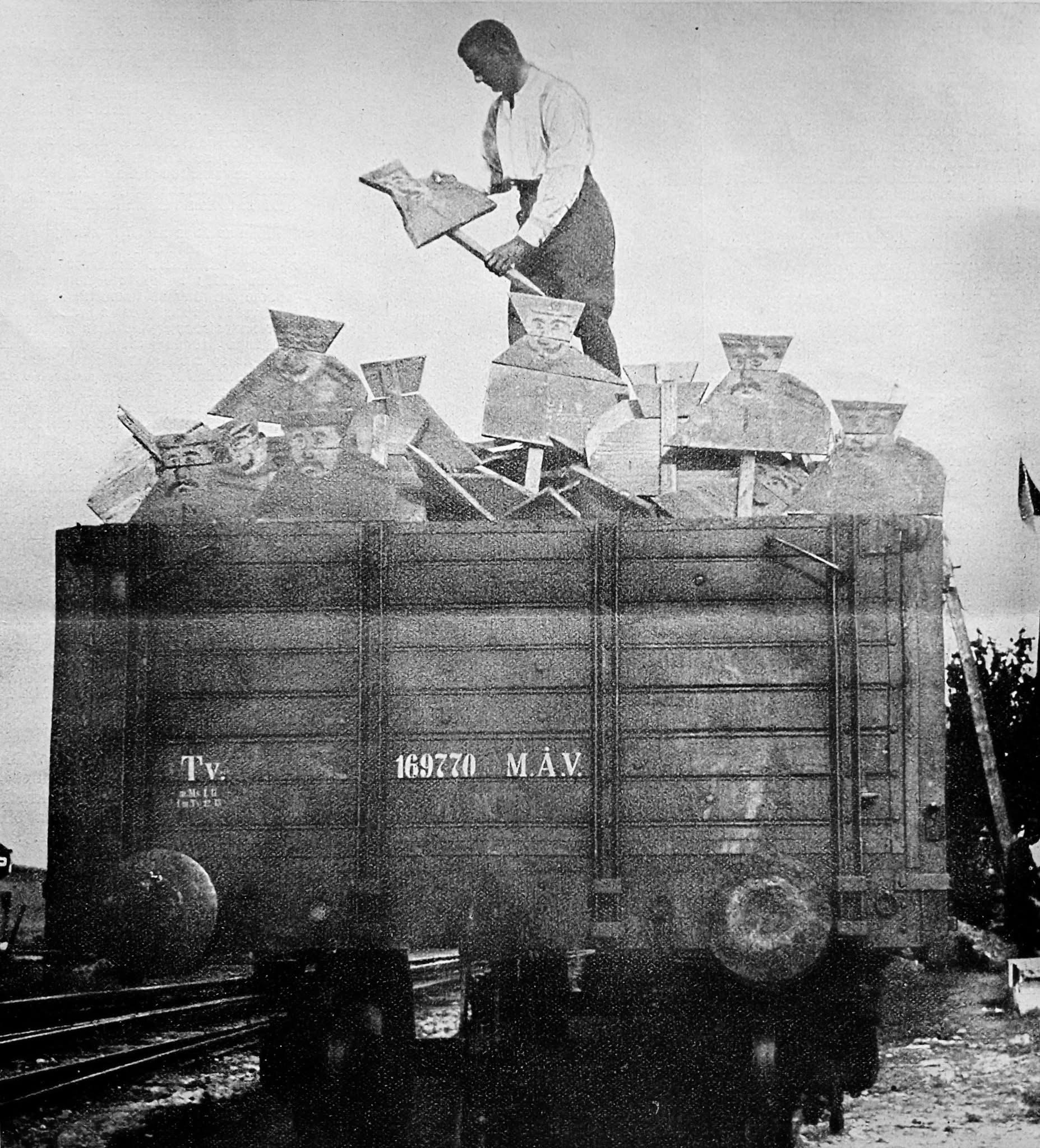 Z válečných událostí jara roku 1915 - "Válečná lest Rusů. V posledních bojích v Polsku ukořistěn byl ruský vagon s dřevěnými maskami, jakých používají Rusové na oklamání svého odpůrce, aby oheň baterií obrátily na dřevěné figury".