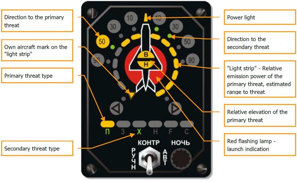 Ukrajinský pilot Su-25 při práci kdesi na východě Ukrajiny. To co v kokpitu bliká jako Vánoční stromek je varovný radar (RWR). Ten detekuje emise radiových vln radarovými systémy a jeho úkolem je vyhodit varovný signál, když je potenciální hrozba detekována. Varování může být užito k vyhýbání se hrozbě. Tyto systémy bývají značně sofistikované a dokáží navíc klasifikovat nebo identifikovat zdroj signálu analýzou vlnových charakteristik signálu.
