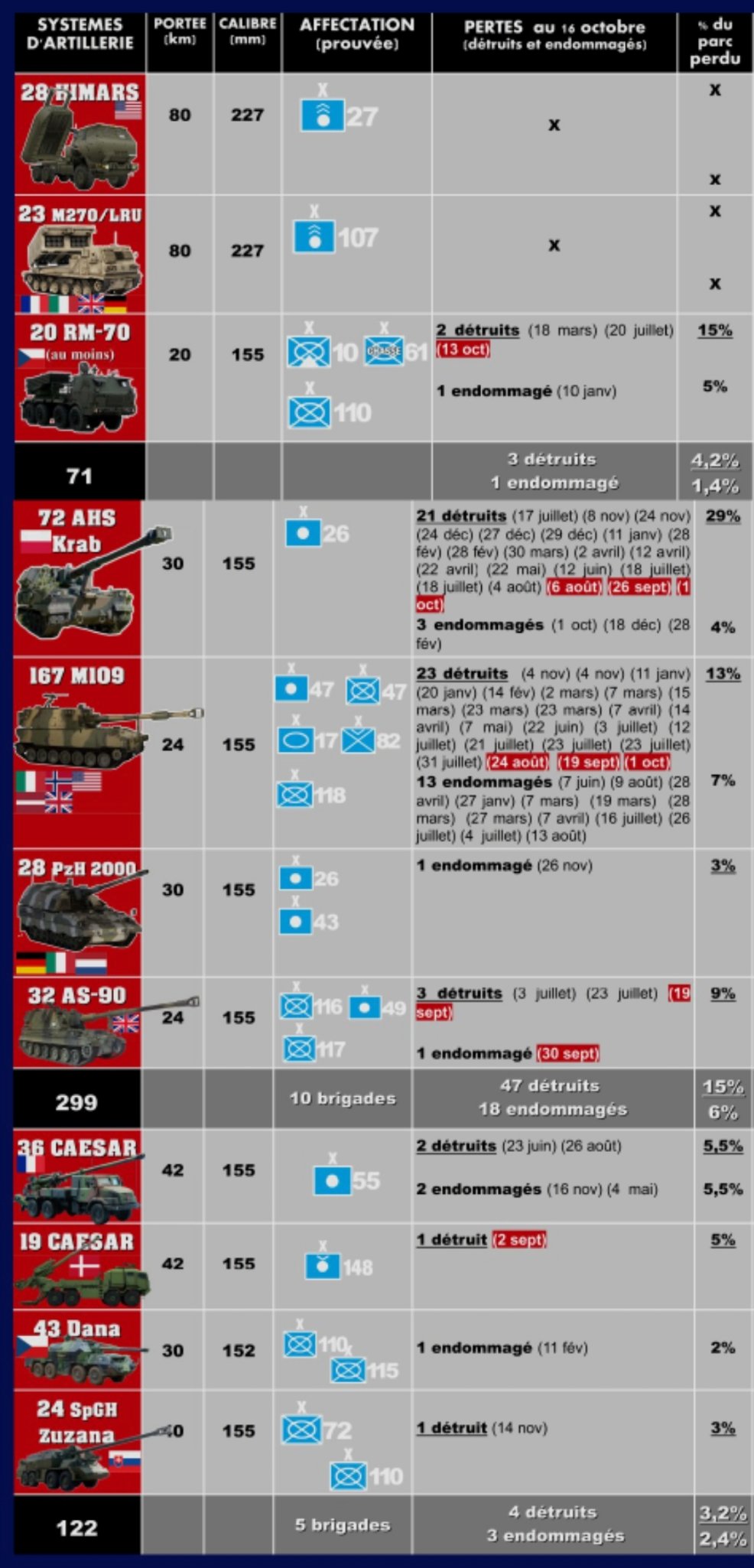 Aktuální stav ukrajinského dělostřelectva (zaznamenané ztráty a poškozená technika).