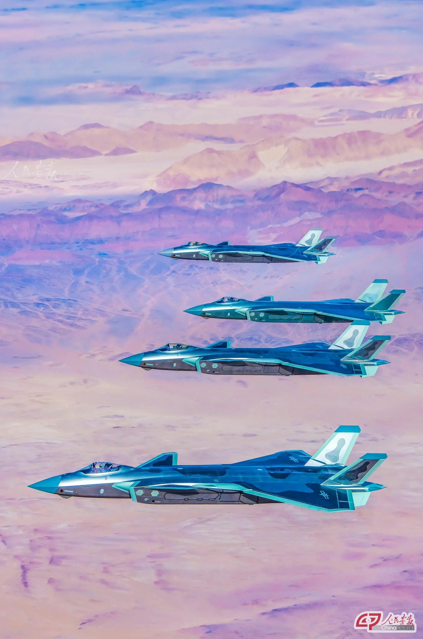 Čínská propagační fotografie stíhaček Chengdu J-20.