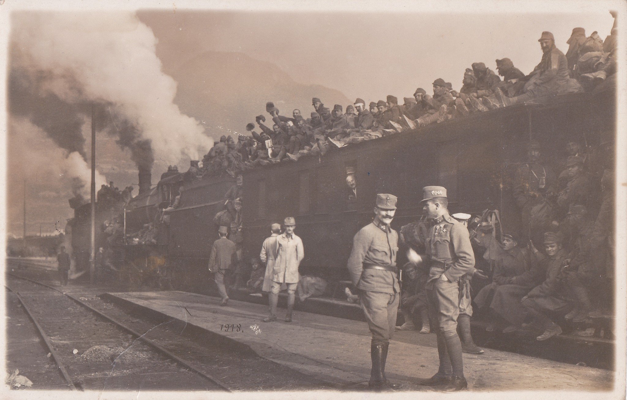 Cesta domů - fotografie byla pořízena pravděpodobně na přelomu října a listopadu 1918, na trati Villach–Franzensfeste. Pevnost Franzenfeste byla postavena v první polovině 19. století a měla za úkol zabránit vstupu nepřítele do Brennerského průsmyku. Villach se nachází v Korutansku a jde o důležitý dopravní uzel celé oblasti jižního Rakouska i celého alpsko-adriatického regionu. Zmíněná trať byla zvaná Pusterthalbahn a tak si rovnou povíme i něco víc k její historii. Již v roce 1858 měla Jižní dráha své první plány a krátce poté i stavební povolení na spojení Vídně s Tyrolskem prostřednictvím Jižní dráhy (Südbahn-Gesellschaft). Společnost Hügel & Sager byla pověřena výstavbou trati a stavba začala koncem podzimu 1869. Protože práce postupovaly mnohem rychleji než bylo plánováno, byl provoz na 209 kilometrů dlouhém úseku Villach–Franzensfeste zahájen 20. listopadu 1871, tedy o celý rok dříve než bylo původně plánováno. Zatímco Drávská dráha (Drautalbahn) byla postavena jako rovinatá trať z Villachu do Lienzu, její další trasa do Franzensfeste je již dráha horská, která dosahuje svého nejvyššího bodu v sedle Toblach v nadmořské výšce přibližně 1 215 metrů. Jedním z původních účelů Pusterské dráhy (Pusterthalbahn) bylo propojit Východní Tyrolsko s jeho hlavním městem Innsbruckem. S rozpadem Dunajské monarchie a ztrátou Jižního Tyrolska Itálií po skončení první světové války však význam trasy prudce poklesl.